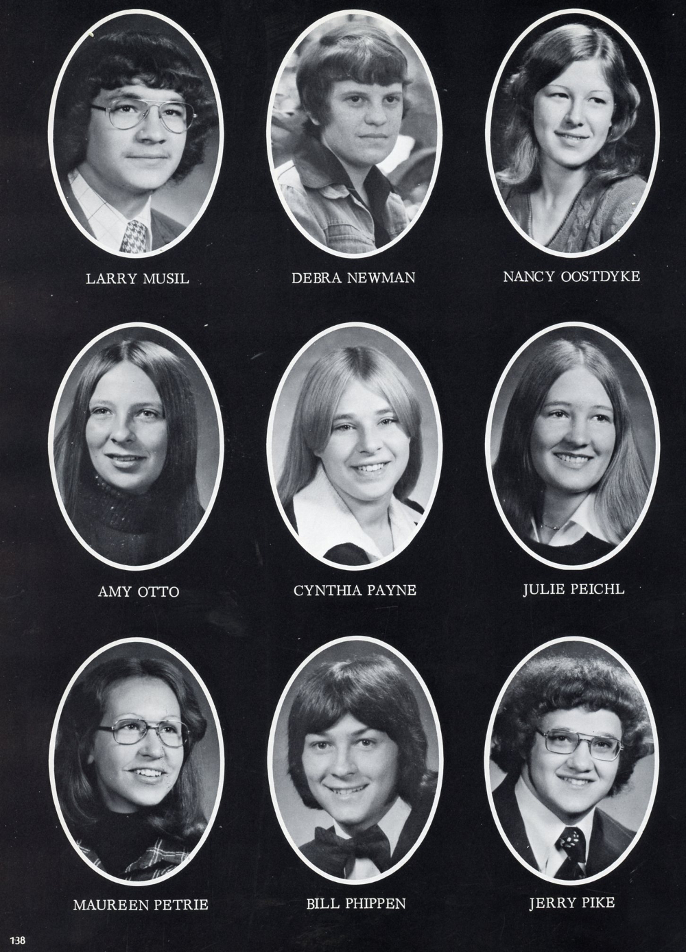 1976 Sheboygan Falls High School, Page 138: Larry Musil, Debra Newman, Nancy Oostdyke, Amy Otto, Cynthia Payne, Julie Peichl, Maureen Petrie, Bill Phippin, Jerry Pike.