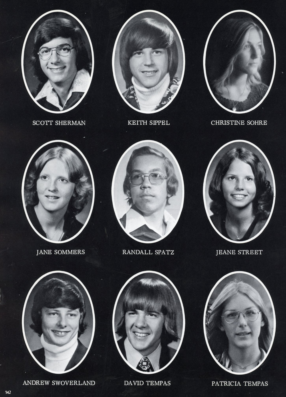 1976 Sheboygan Falls High School, Page 142: Scott Sherman, Keith Sippel, Christine Sohre, Jane Sommers, Randall Spatz, Jeane Street, Andrew Swoverland, David Tempas, Patricia Tempas.
