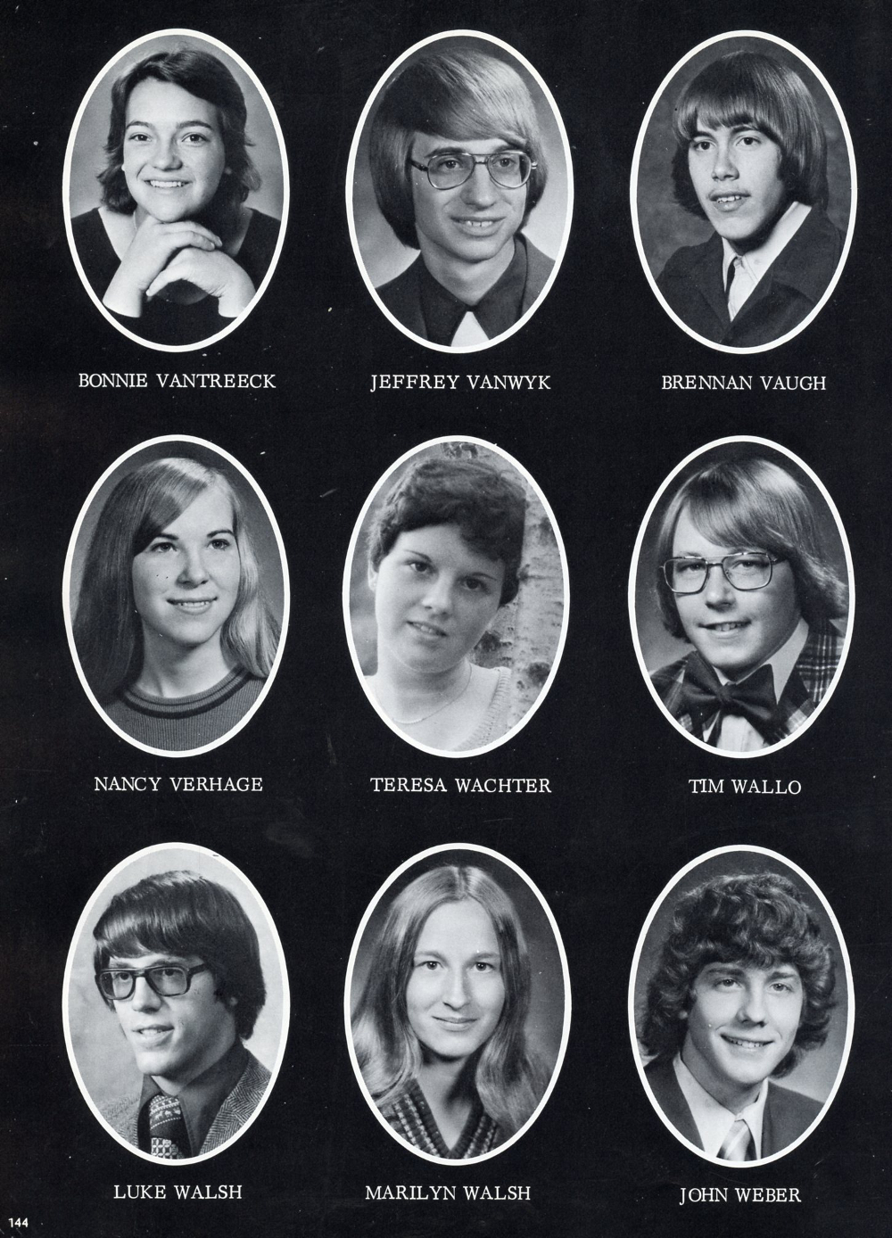 1976 Sheboygan Falls High School, Page 144: Bonnie VanTreeck, Jeffrey VanWyk, Brennan Vaugh, Nancy Verhage, Teresa Wacher, Tim Wallo, Luke Walsh, Marilyn Walsh, John Weber.