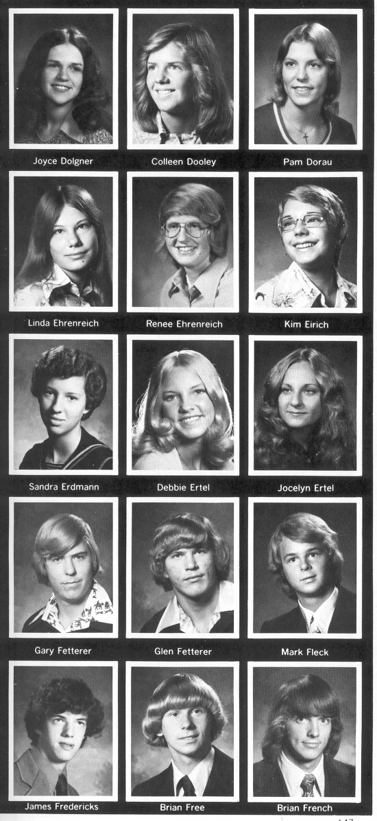 1976 Sheboygan North High School, Page 147: Joyce Dolgner, Colleen Dooley, Pam Dorau, Linda Ehrenreich, Renee Ehrenreich, Kim Eirich, Sandra Erdmann, Debbie Ertel, Jocelyn Ertel, Gary Fetterer, Glen Fetterer, Mark Fleck, James Fredericks, Brian Free, Brian French.