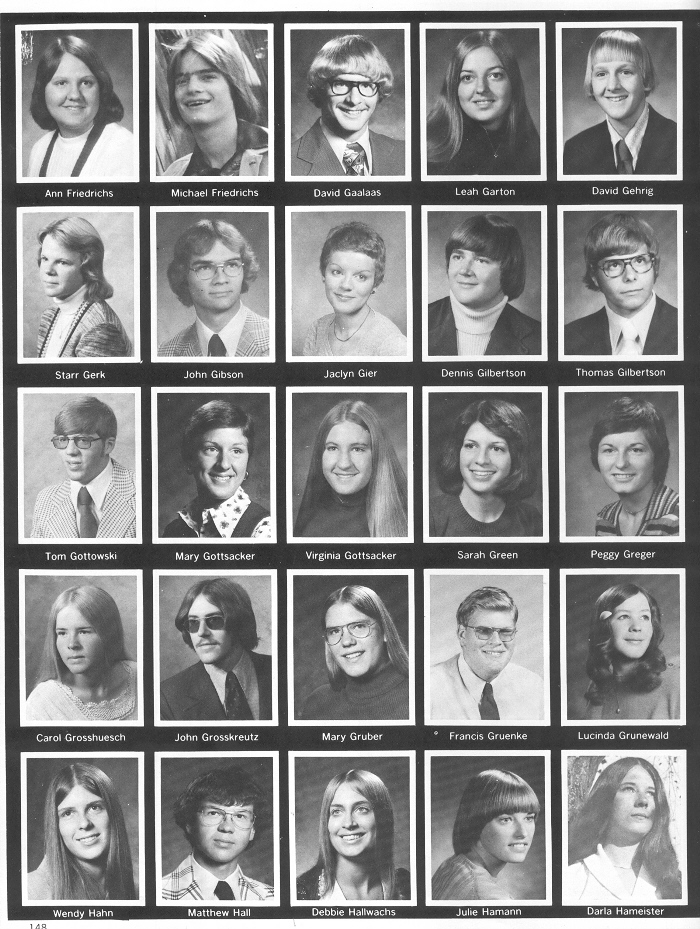 1976 Sheboygan North High School, Page 148: Ann Friedrichs, Michael Friedrichs, David Gaalaas, Leah Garton, David Gehrig, Starr Gerk, John Gibson, Jaclyn Gier, Dennis Gilbertson, Thomas Gilbertson, Tom Gottowski, Mary Gottsacker, Vigginia Gottsacker, Sarah Green, Peggy Greger, Carol Grosshuesch, John Grosskreutz, Mary Gruber, Francis Gruenke, Lucinda Grunewald, Wendy Hahn, Matthew Hall, Debbie Hallwachs, Julie Hamann, Darla Hameister.