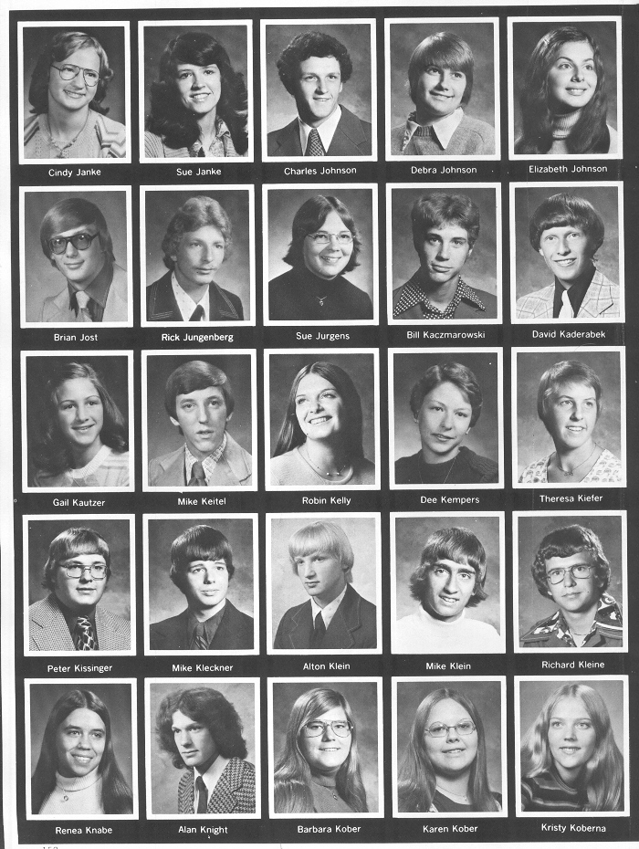 1976 Sheboygan North High School, Page 152: Cindy Janke, Sue Janke, Charles Johnson, Debra Johnson, Elizabeth Johnson, Brian Jost, Rick Jungenberg, Sue Jurgens, Bill Kaczmarowski, David Kaderabek, Gail Kautzer, Mike Keitel, Robin Kelly, Dee Kempers, Theresa Kiefer, Peter Kissinger, Mike Kleckner, Alton Klein, Mike Klein, Richard Kleine, Renea Knabe, Alan Knight, Barbara Kober, Karen Kober, Kristy Koberna.