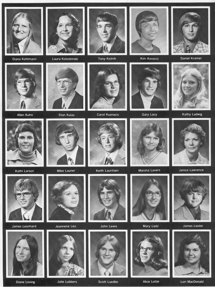 1976 Sheboygan North High School, Page 154: Diana Kohlmann, Laura Kolodzinski, Tony Kotnik, Kim Kovacic, Daniel Kramer, Allen Kuhn, Stan Kulas, Carol Kuznacic, Gary Lacy, Kathy Ladwig, Kathi Larson, Mike Launer, Keith Lauritsen, Marsha Lavers, Janice Lawrence, James Leonhard, Jeannene Leu, John Lewis, Mary Liebl, James Lieske, Diane Loving, Julie Lubbers, Scott Luedke, Alice Lutze, Lori MacDonald.