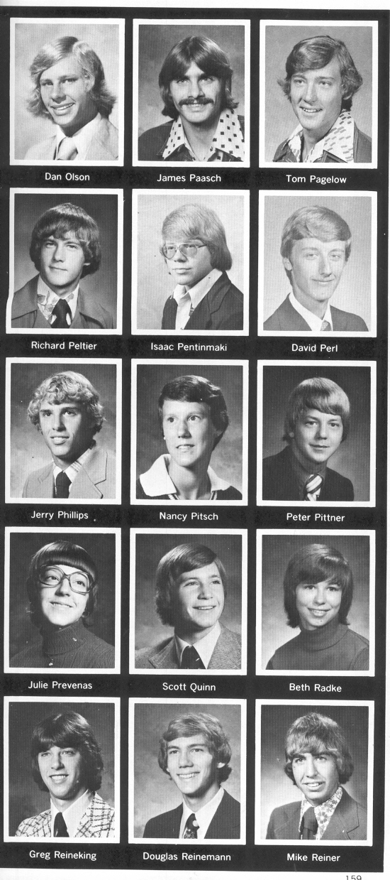 1976 Sheboygan North High School, Page 159: Dan Olson, James Paasch, Tom Pagelow, Richard Peltier, Isaac Pentinmaki, David Perl, Jerry Phillips, Nancy Pitsch, Peter Pittner, Julie Prevenas, Scott Quinn, Beth Radke, Greg Reineking, Douglas Reinemann, Mike Reiner.