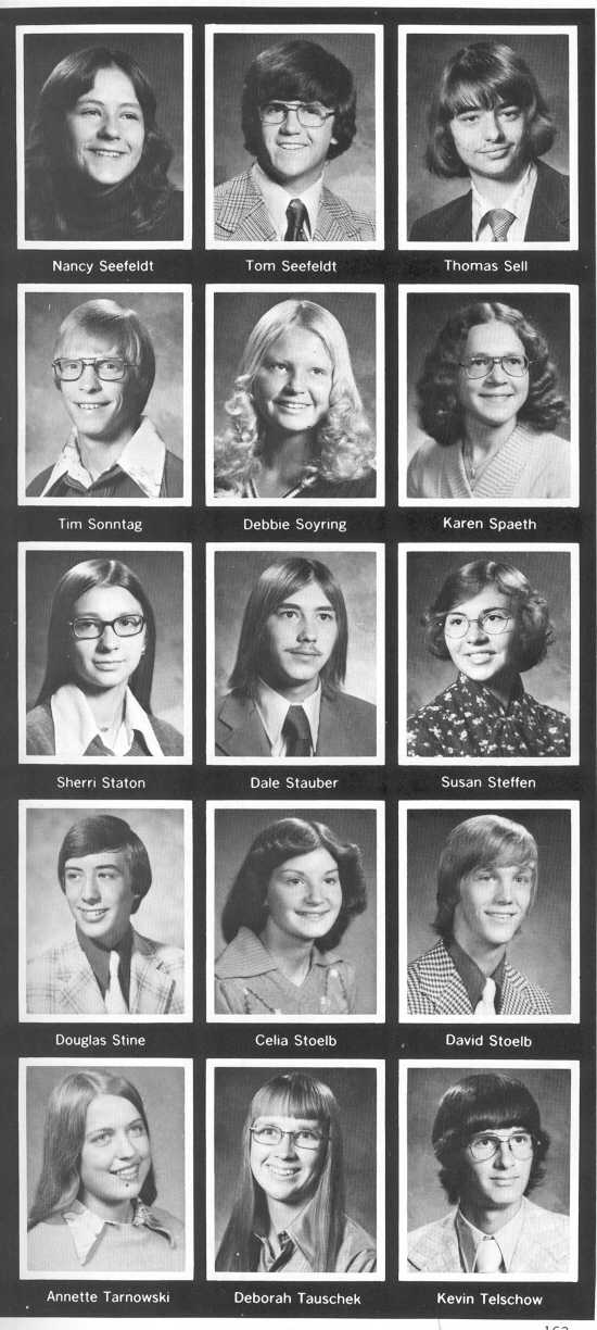 1976 Sheboygan North High School, Page 163: Nancy Seefeldt, Tom Seefeldt, Thomas Sell, Tim Sonntag, Debbie Soyring, Karen Spaeth, Sherri Staton, Dale Stauber, Susan Steffen, Douglas Stine, Celia Stoelb, David Stoelb, Annette Tarnowski, Deborah Tauschek, Kevin Telschow.