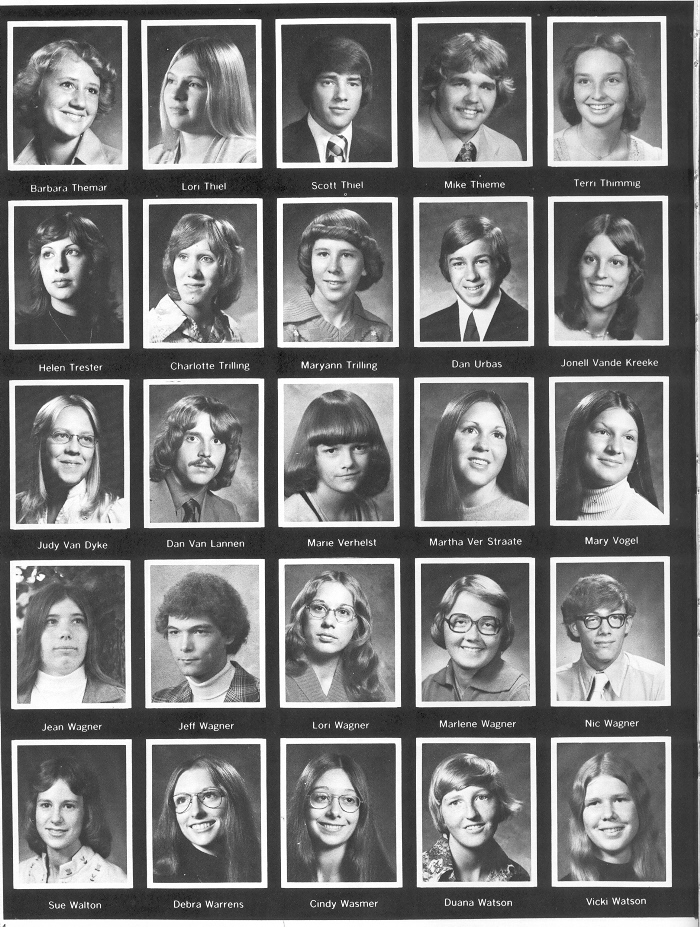 1976 Sheboygan North High School, Page 164: Barbara Themar, Lori Thiel, Scott Thiel, Mike Thieme, Terri Thimmig, Helen Trester, Charlotte Trilling, Maryann Trilling, Dan Urbas, Jonell Vande Kreeke, Judy Van Dyke, Dan Van Lannen, Marie Verhelst, Martha Ver Straate, Mary Vogel, Jean Wagner, Jeff Wagner, Lori Wagner, Marlene Wagner, Kic Wagner, Sue Walton, Debra Warrens, Cindy Wasmer, Duana Watson, Vicki Watson.