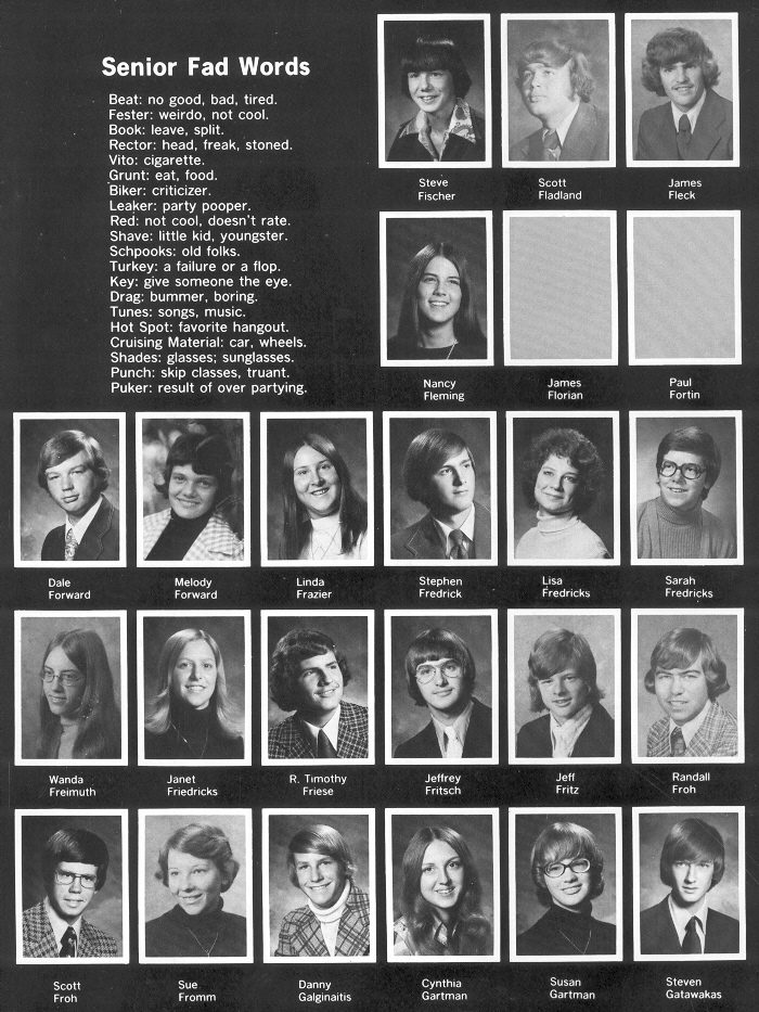 1976 Sheboygan South High School, Page 30: Steve Fischer, Scott Fladland, James Fleck, Nancy Fleming, James Florian, Paul Fortin, Dale Forward, Melody Forward, Linda Frazier, Stephen Fredrick, Lisa Fredricks, Sarah Fredricks, Wanda Freimuth, Janet Friedricks, R. Timothy Friese, Jeffrey Fritsch, Jeff Fritz, Randall Froh, Scott Froh, Sue Fromm, Danny Galginaltis, Cynthis Gartman, Susan Gartman, Steven Gatawakas.