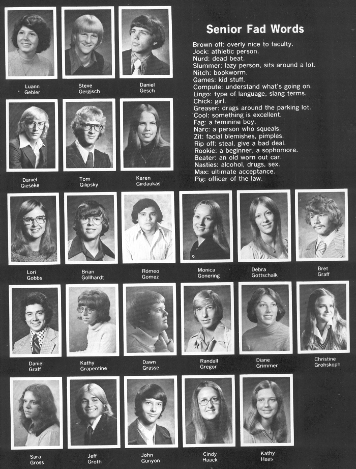 1976 Sheboygan South High School, Page 31: Luann Gebler, Steve Gergisch, Daniel Gesch, Daniel Gieseke, Tom Gilipsky, Karen Girdaukas, Lori Gobbs, Brian Gollhardt, Romeo Gomez, Monica Gonering, Debra Gottschalk, Gret Graff, Daniel Graff, Kathy Grapentine, Dawn Grasse, Randall Gregor, Diane Grimmer, Christine Grohskoph, Sara Gross, Jeff Groth, John Gunyon, Cindy Haack, Kathy Haas.