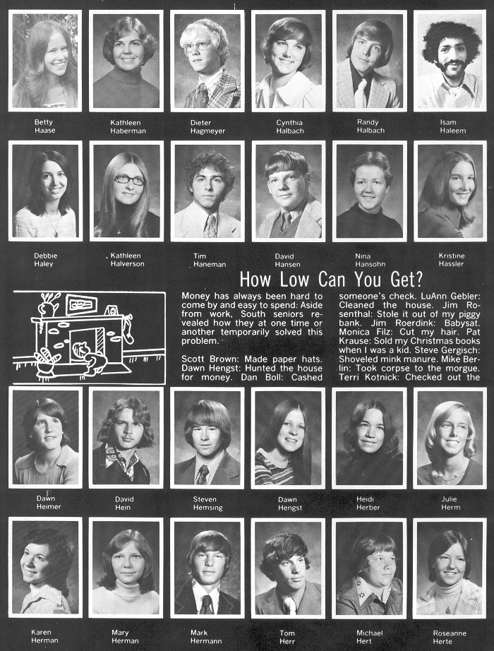 1976 Sheboygan South High School, Page 32: Betty Haase, Kathleen Haberman, Dieter Hagmeyer, Cynthia Halbach, Randy Halbach, Isam Haleem, Debbie Haley, Kathleen Halverson, Tim Haneman, David Hansen, Nina Hansohn, Kristine Hassler, Dawn Heimer, David Hein, Steven Hemsing, Dawn Hengst, Heidi Herber, Julie Herm, Karen Herman, Mary Herman, Mark Hermann, Tom Herr, Michael Hert, Roseanne Herte.