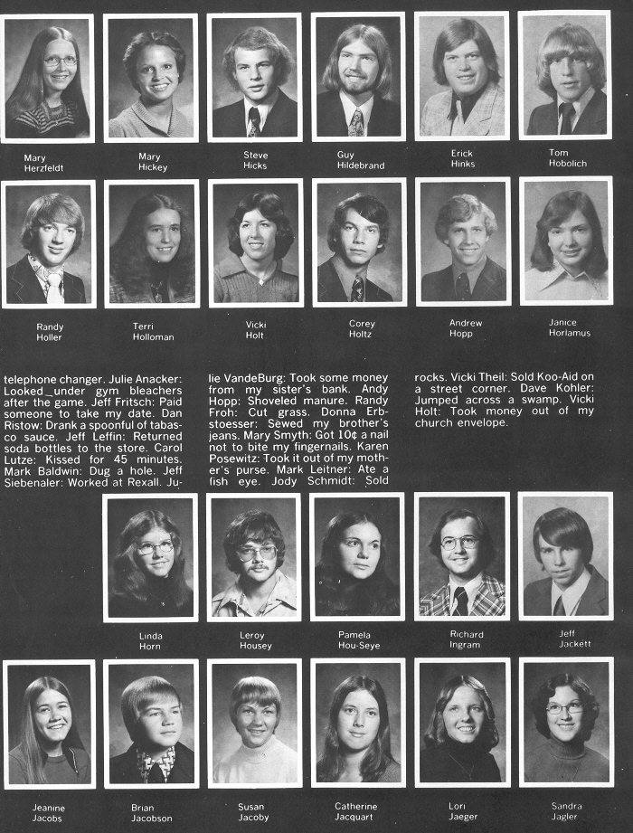 1976 Sheboygan South High School, Page 33: Mary Herzfeldt, Mary Hickey, Steve Hicks, Guy Hildebrand, Erick Hinks, Tom Hobolich, Randy Holler, Terri Holloman, Vicki Holt, Corey Holtz, Andrew Hopp, Janice Horlamus, Linda Horn, Leroy Housey, Pamela Hou-Seye, Richard Ingram, Jeff Jackett, Jeanine Jacobs, Brian Jacobson, Susan Jacoby, Catherine Jacquart, Lori Jaeger, Sandra Jagler.