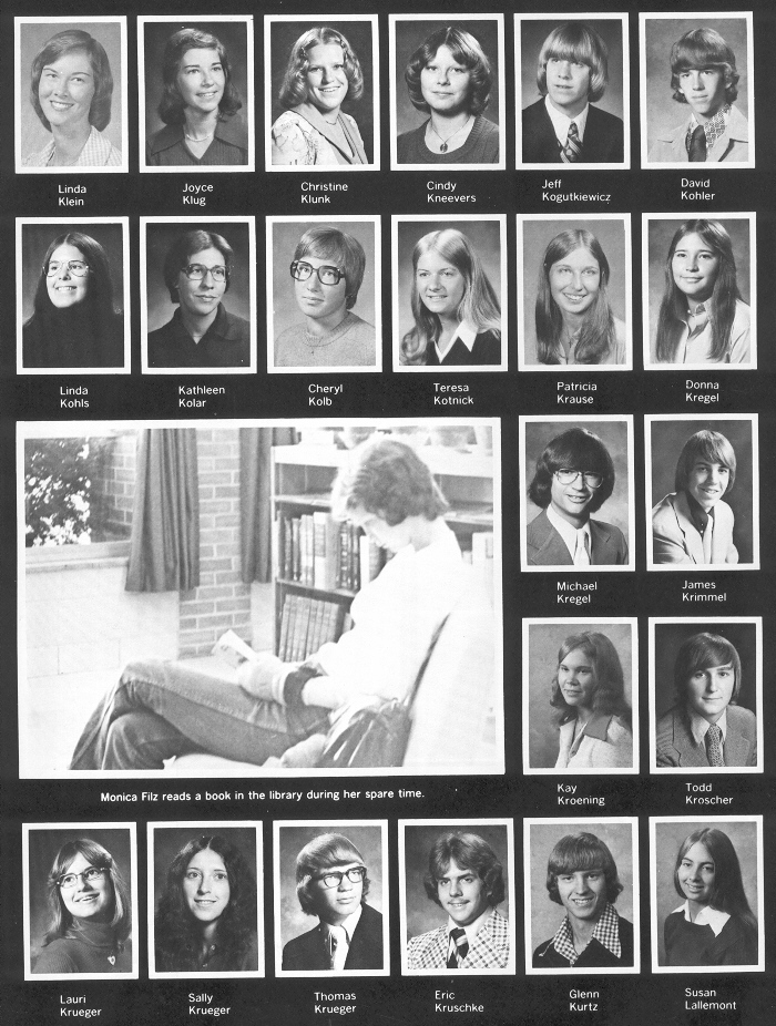 1976 Sheboygan South High School, Page 35: Linda Klein, Joyce Klug, Christine Klunk, Cindy Kneevers, Jeff Kogutkiewicz, David Kohler, Linda Kohls, Kathleen Kolar, Cheryl Kolb, Teresa Kotnick, Patricia Krause, Donna Kregel, Michael Kregel, James Krimmel, Kay Kroening, Todd Kroscher, Lauri Krueger, Sally Krueger, Thomas Krueger, Eric Kruschke, Glenn Kurtz, Susan Lallemont.
