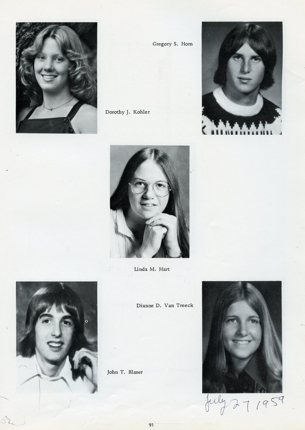 1977 Kohler High School, Page 91: Dorothy J. Kohler, Gregory S. Horn, Linda M. Hart, John T. Blaser, Dianne D. Van Treeck.
