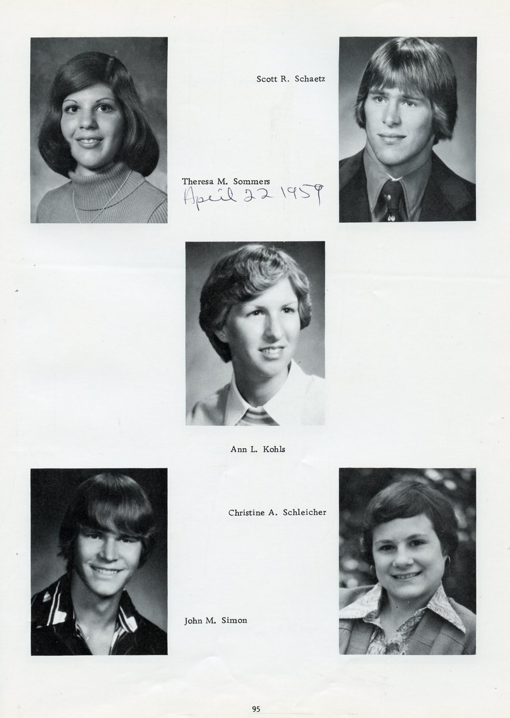 1977 Kohler High School, Page 95: Theresa M. Sommers, Scott R. Schaetz, Ann L. Kohls, John M. Simon, Christine A. Schleicher.
