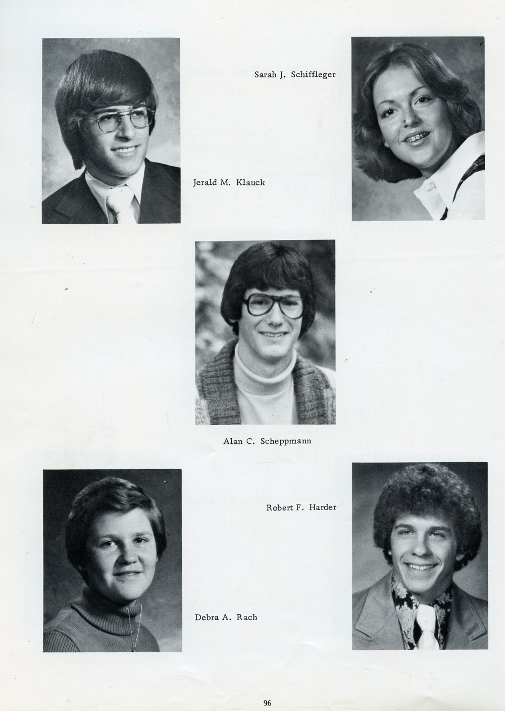 1977 Kohler High School, Page 96: Jerald M. Klauck, Sarah J. Schiffleger, Alan C. Scheppmann, Debra A. Rach, Robert F. Harder.