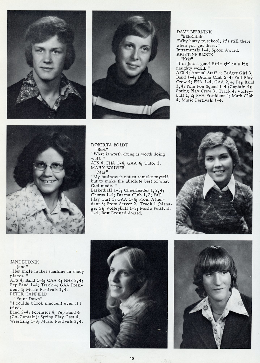 1977 Oostburg High School Yearbook Page 10: Dave Beernink, Kristine Block, Roberta Boldt, Mary Bouwer, Jane Budnik, Peter Canfield.