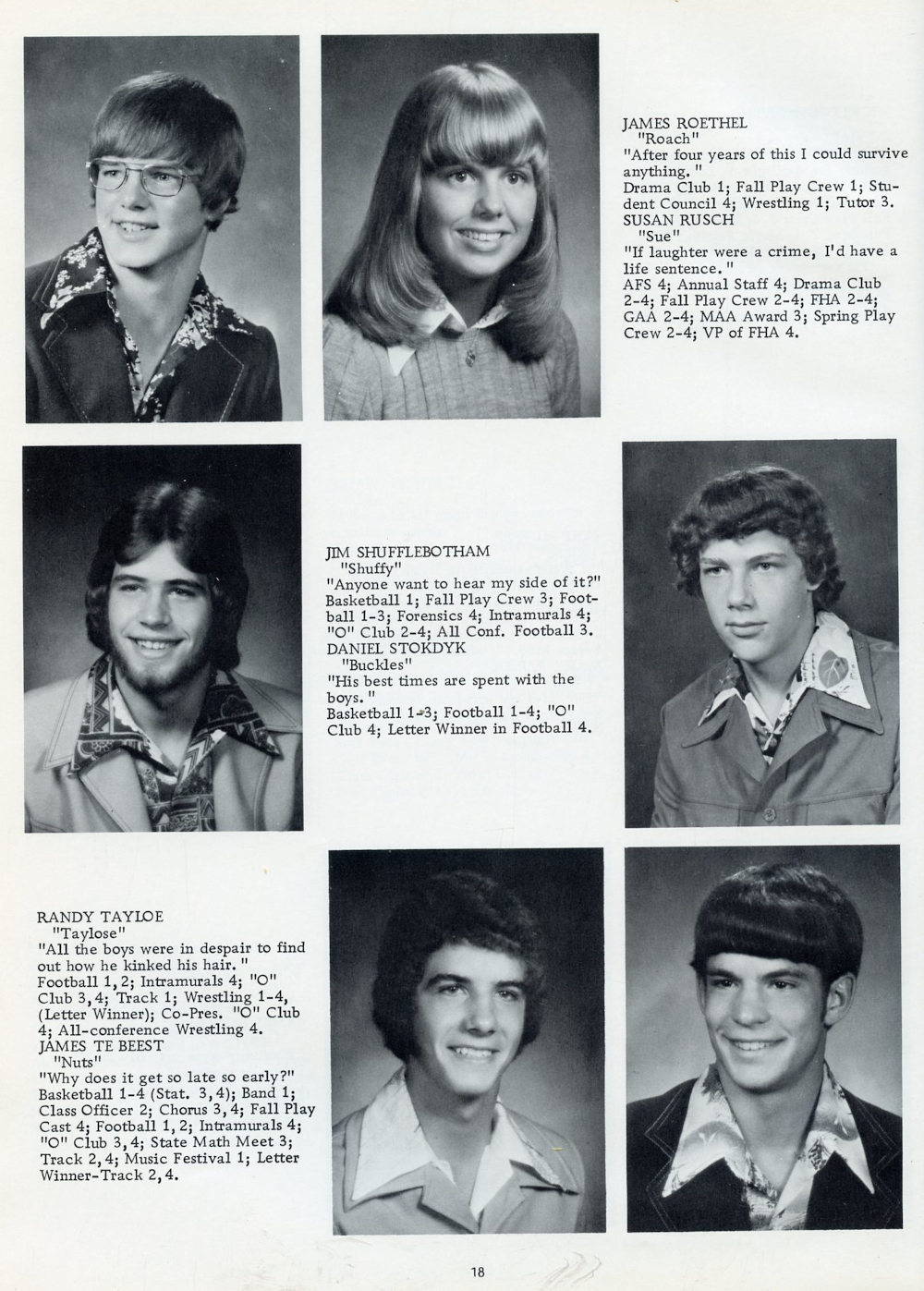 1977 Oostburg High School Page 18: James Roethel, Susan Rusch, Jim Shufflebotham, Daniel Stokdyk, Randy Tayloe, James Te Beest.