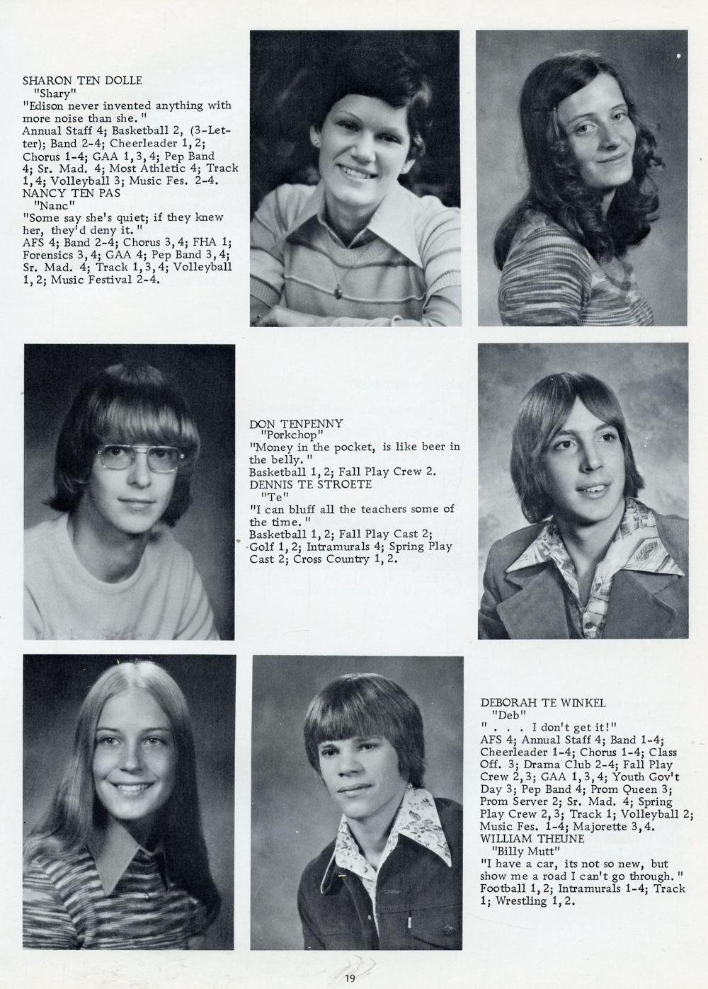 1977 Oostburg High School Page 19: Sharon Ten Dolle, Nancy Ten Pas, Don Tenpenny, Dennis Te Stroete, Deborah Te Winkel, William Theune.