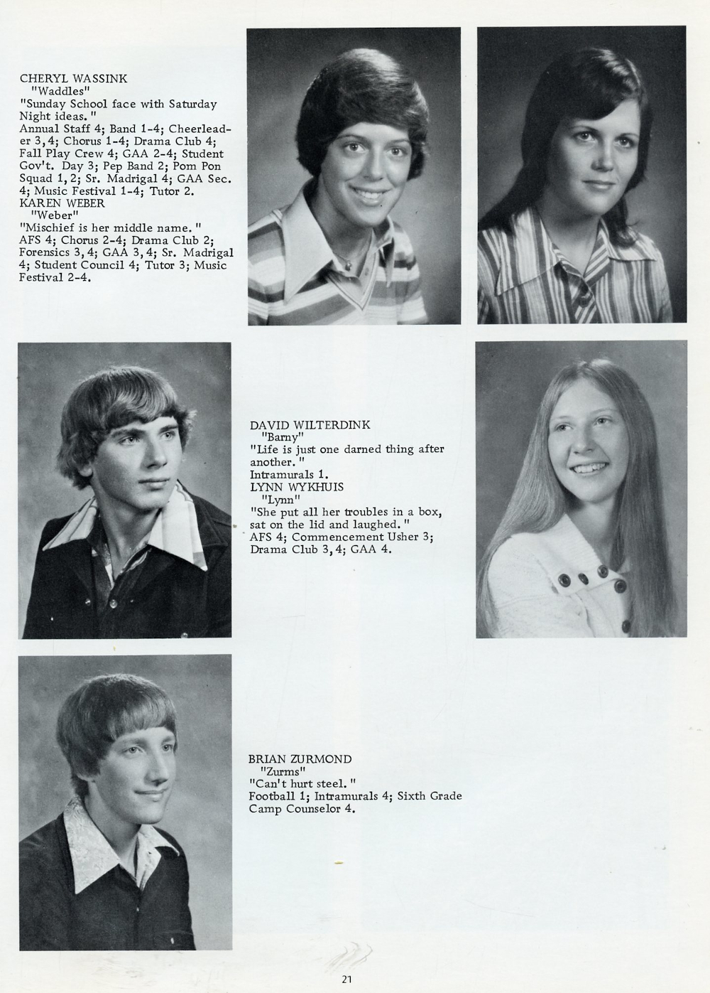 1977 Oostburg High School Page 21: Cheryl Wassink, Karern Weber, David Wilterdink, Lynn Wykhuis, Brian Zurmond.