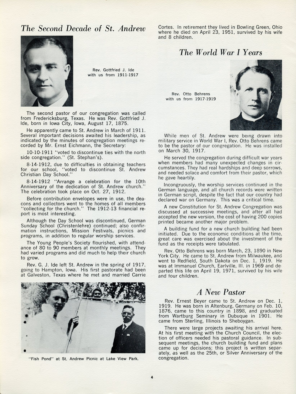 1977 St. Andrews Lutheran Church 75th Anniversary Page 4: The Second Decade of St. Andrews, The World War 1 Years, A New Pastor.