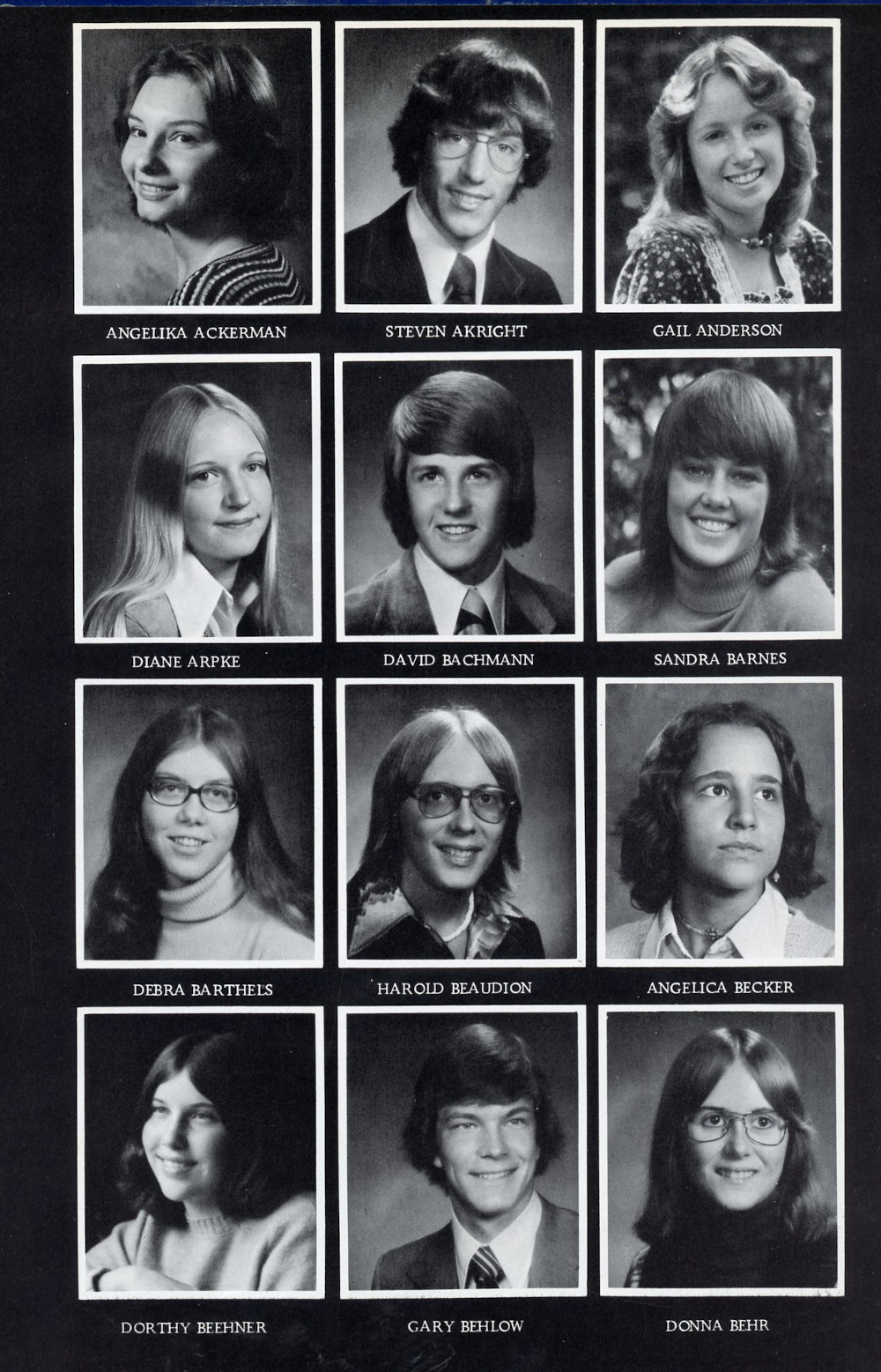 1977 Sheboygan Falls High School Page 123: Angelina Ackerman, Steven Akright, Gail Anderson, Diane Arpke, David Bachmann, Sandra Barnes, Debra Barthels, Harold Beaudion, Angelica Becker, Dorthy Beehner, Gary Behlow, Donna Behr.