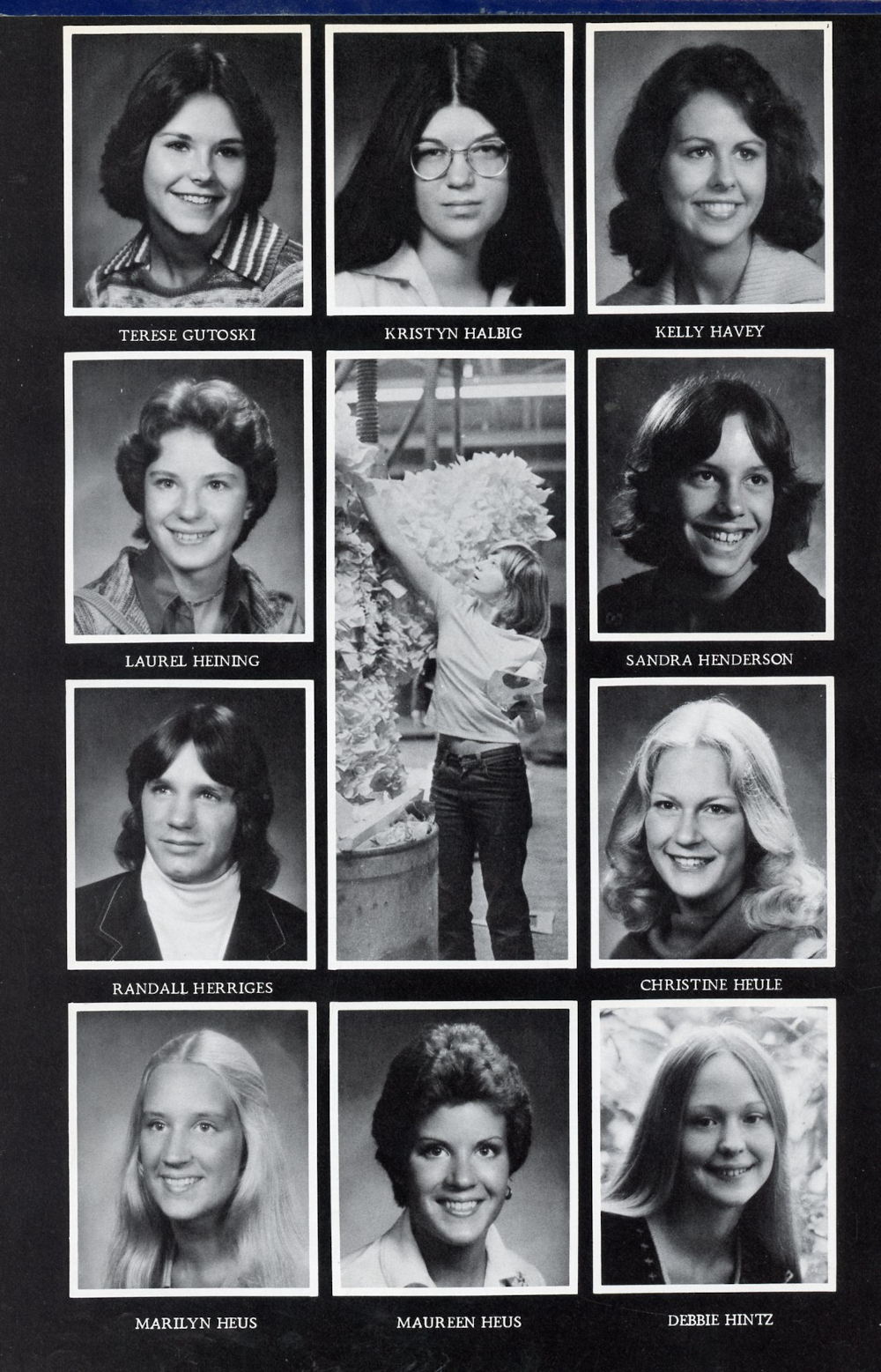 1977 Sheboygan Falls High School Yearbook Page 127: Terese Gutoski, Kristyn Halbig, Kelly Havey, Laurel Heining, Sandra Henderson, Randall Herriges, Christine Heule, Marilyn Heus, Maureen Heus, Debbie Hintz.