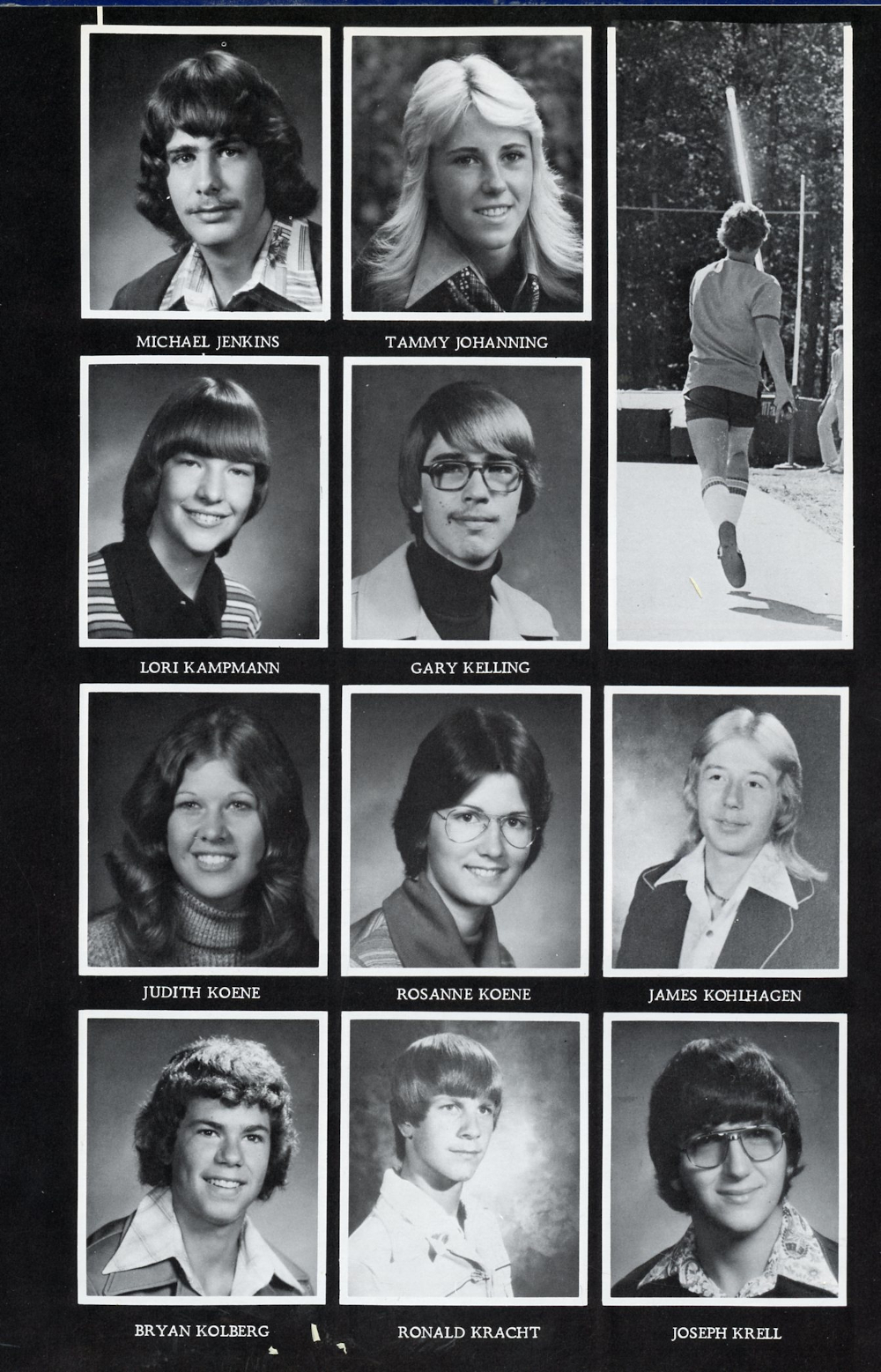 1977 Sheboygan Falls High School Yearbook Page 129: Michael Jenkins, Tammy Johanning, Lori Kampmann, Gary Kelling, Judith Koene, Rosanne Koene, James Kohlhagen, Bryan Kolberg, Ronald Kracht, Joseph Krell.