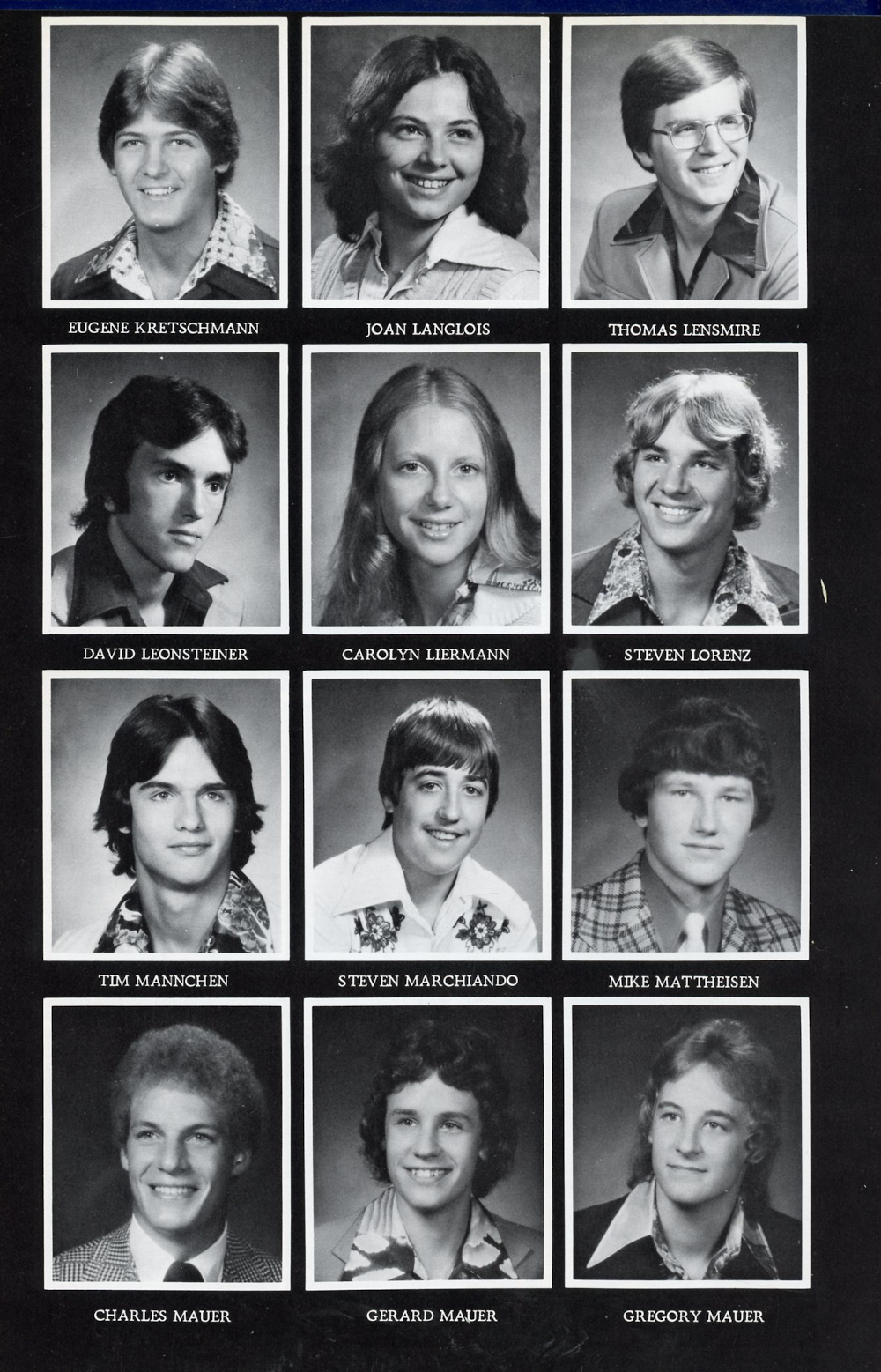 1977 Sheboygan Falls High School Yearbook Page 130: Eugene Kretschmann, Joan Langlois, Thomas Lensmire, David Leonsteiner, Carolyn Liermann, Steven Lorenz, Tim Mannchen, Steven Marchiando, Mike Mattheisen, Charles Mauer, Gerard Mauer, Gergory Mauer.