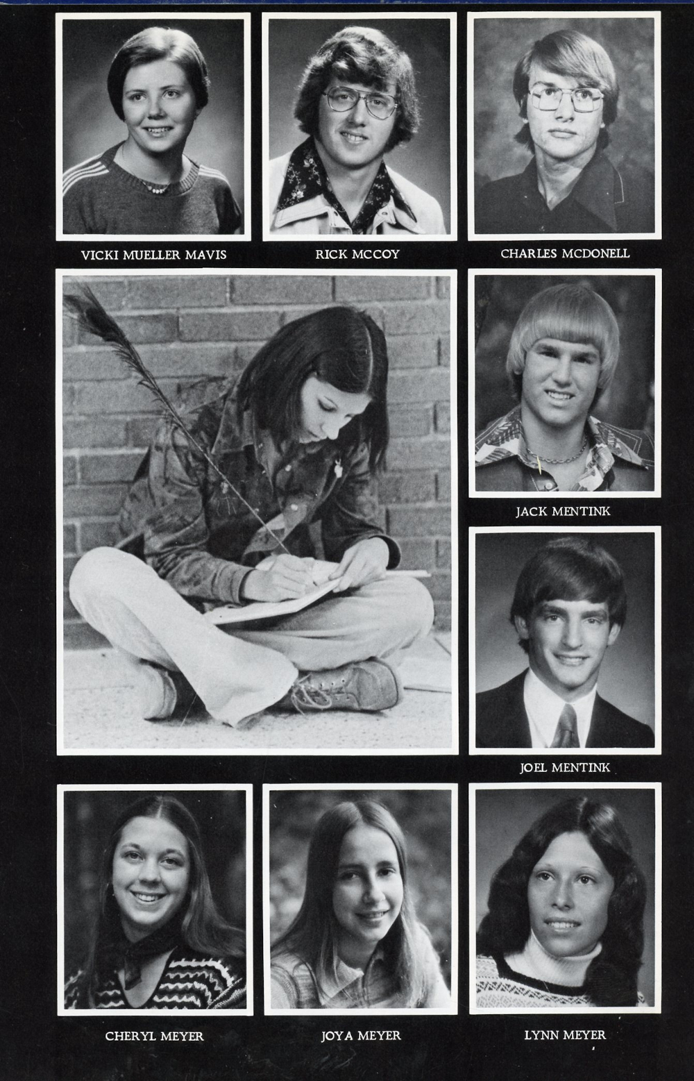 1977 Sheboygan Falls High School Yearbook Page 131: Vicki Mueller Mavis, Rick McCoy, Charles McDonell, Jack Mentink, Joel Mentink, Cheryl Meyer, Joya Meyer, Lynn Meyer.