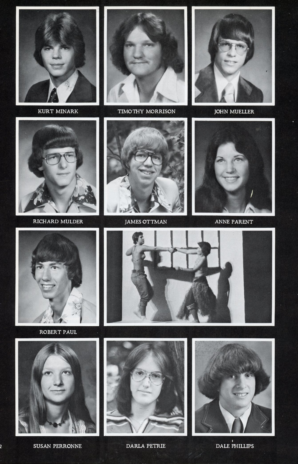 1977 Sheboygan Falls High School Yearbook Page 132: Kurt Minark, Timothy Morrison, John Mueller, Richard Mulder, James Ottman, Anne Parent, Robert Paul, Susan Perronne, Darla Petrie, Dale Phillips.