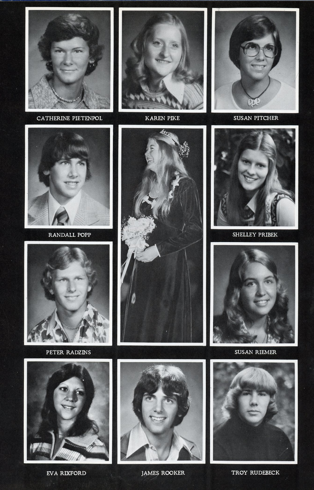 1977 Sheboygan Falls High School Yearbook Page 133: Catherine Pietenpol, Karen Pike, Susan Pitcher, Randall Popp, Shelley Pribek, Peter Radzins, Susan Riemer, Eva Rixford, James Rooker, Troy Rudebeck.