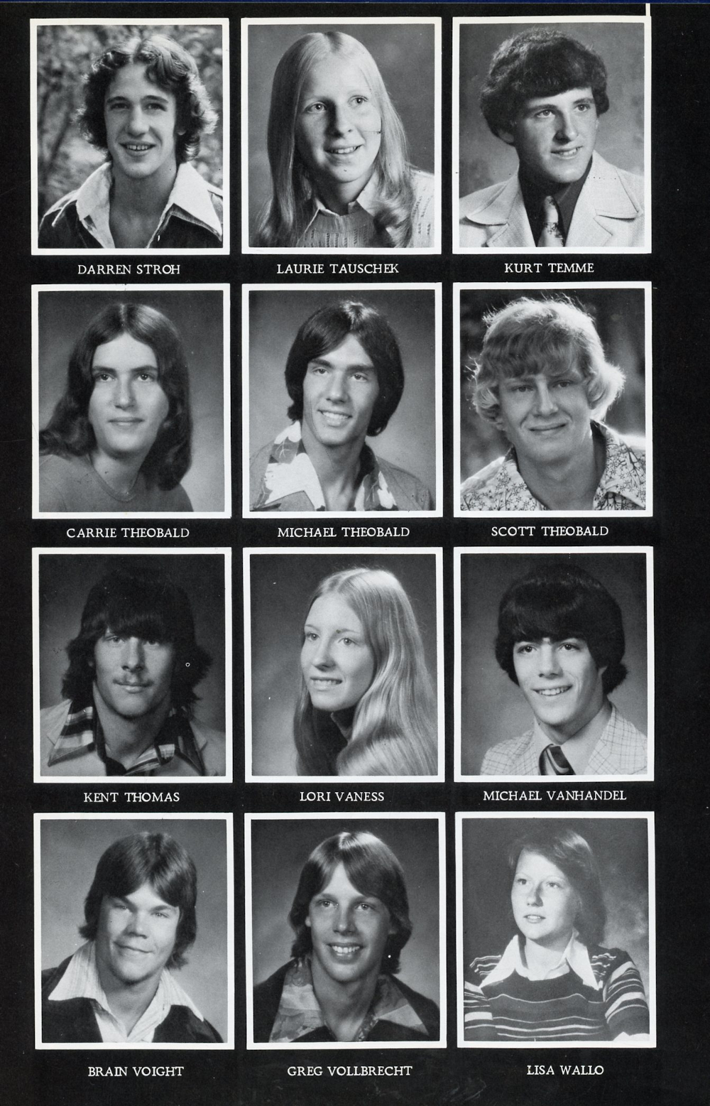 1977 Sheboygan Falls High School Yearbook Page 136: Darren Stroh, Laurie Tauschek, Kurt Temme, Carrie Theobald, Michael Theobald, Scott Theobald, Kent Thomas, Lori Vaness, Michael Vanhandel, Brian Voight, Greg Vollbrecht, Lisa Wallo.