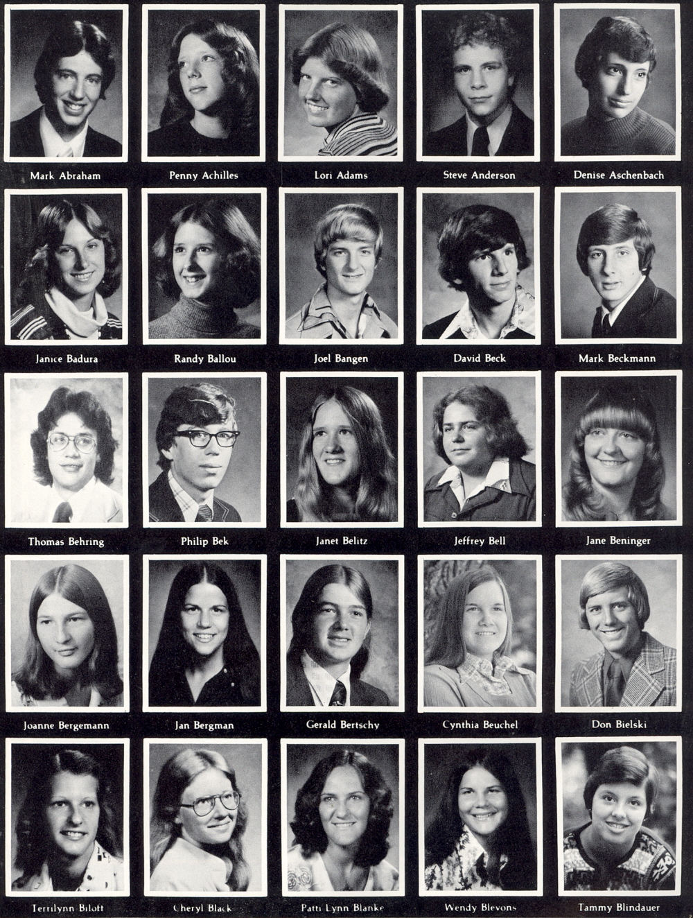 1977 Sheboygan North High School, Page 140: Mark Abraham, Penny Achilles, Lori Adams, Steve Anderson, Denise Aschenbach, Janice Badura, Randy Ballou, Joel Bangen, David Beck, Mark Beckmann, Thomas Behring, Philip Bek, Janet Belitz, Jeffrety Bell, Jane Beninger, Joanne Bergemann, Jan Bergman, Gerald Bertschy, Cynthia Beuchel, Don Bielski, Terrilynn Biloff, Cheryl Black, Patti Blanke, Wendy Blevons, Tammy Blindauer.