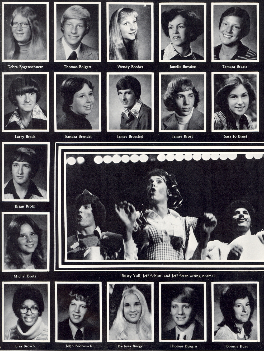 1977 Sheboygan North High School, Page 141: Debra Bogenschuetz, Thomas Bolgert, Wendy Booher, Janelle Bowden, Tamara Braatz, Larry Brack, Sandra Brendel, James Broeckel, James Brost, Sara Jo Brost, Brian Brotz, Michel Brotz, Lisa Brown, John Brozovich, Barbara Buege, Thomas Burgin, Bonnie Buss.