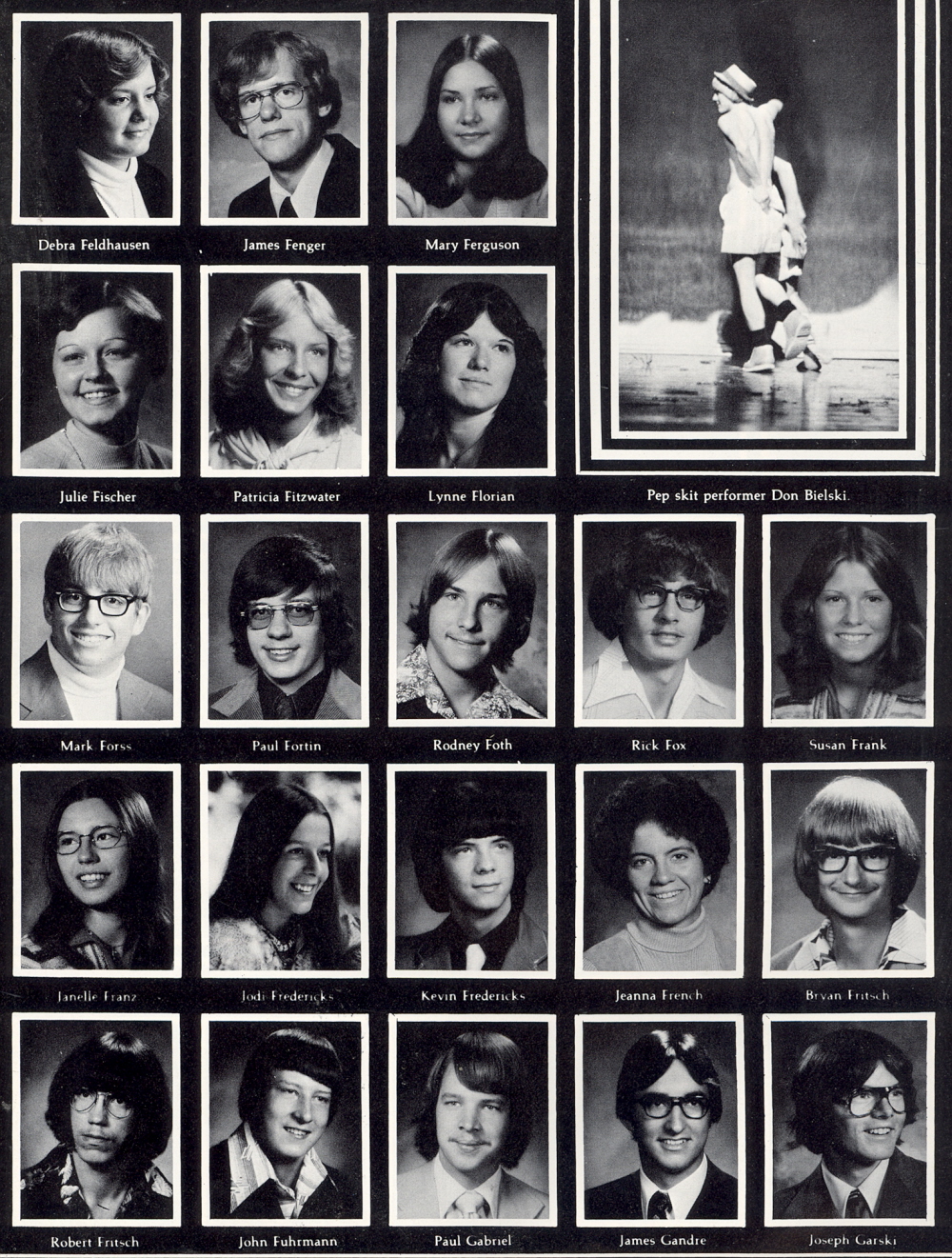 1977 Sheboygan North High School, Page 144: Debra Feldhausen, James Fenger, Mary Ferguson, Julie Fischer, Patricia Fitzwater, Lynne Florian, Mark Forss, Paul Fortin, Rodney Foth, Rick Fox, Susan Frank, Janelle Franz, Jodi Fredericks, Kevin Fredericks, Jeanna French, Bryan Fritsch, Robert Fritsch, John Fuhrmann, Paul Gabriel, James Gandre, Joseph Garski.