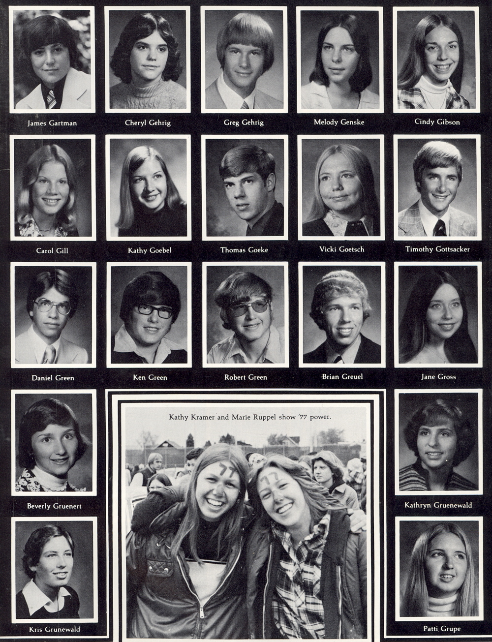 1977 Sheboygan North High School, Page 145: James Gartman, Cheryl Gehrig, Greg Gehrig, Melody Genske, Cindy Gibson, Carol Gill, Kathy Goebel, Thomas Goeke, Vicki Goetsch, Timothy Gottsacker, Daniel Green, Ken Green, Robert Green, Brian Greuel, Jane Gross, Beverly Gruenert, Kathryn Gruenewald, Kris Grunewald, Patti Grupe.