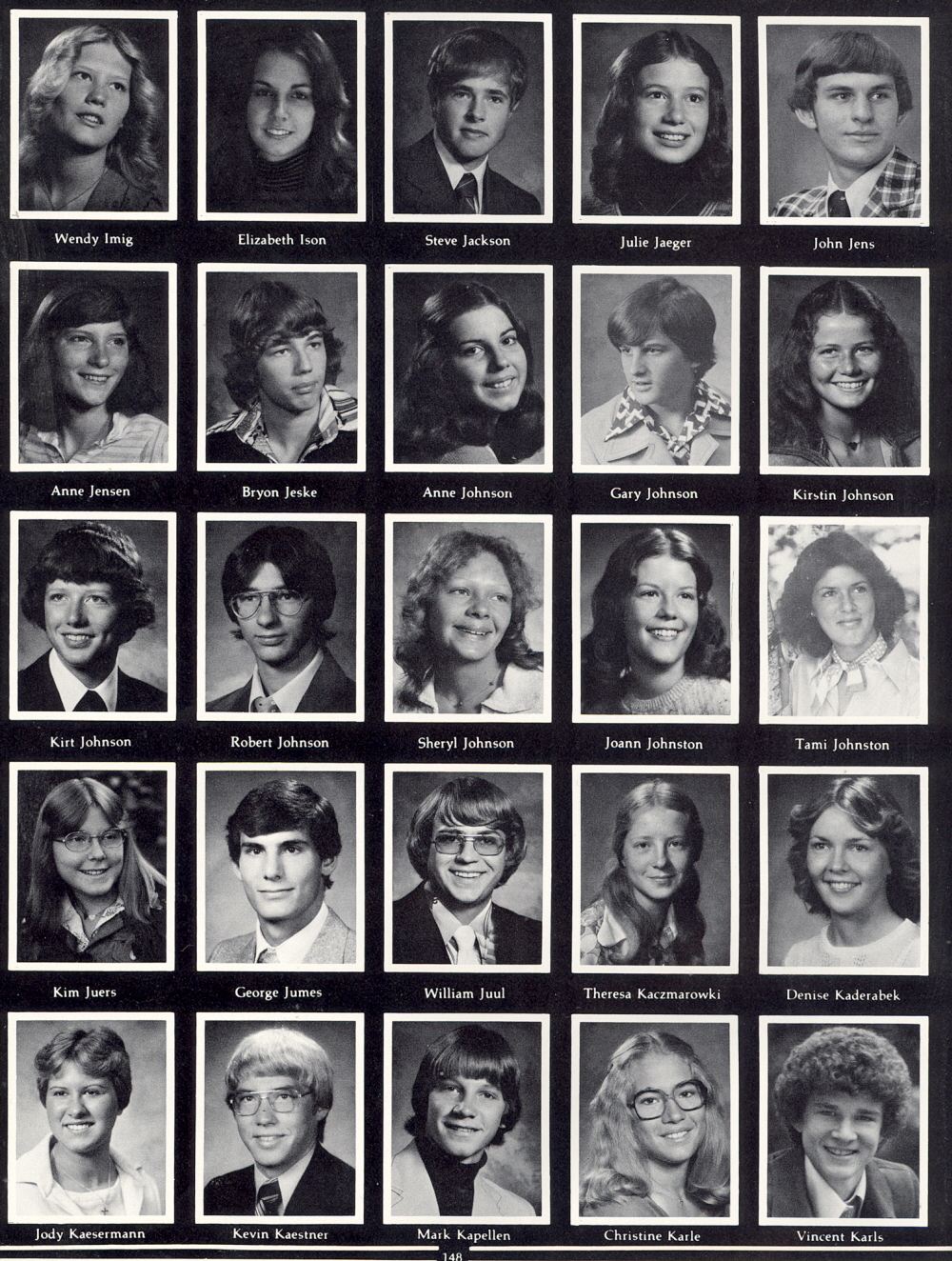 1977 Sheboygan North High School, Page 148: Wendy Imig, Elizabeth Ison, Steve Jackson, Julie Jaeger, John Jens, Anne Jensen, Bryon Jeske, Anne Johnson, Gary Johnson, Kirstin Johnson, Kurt Johnson, Robert Johnson, Sheryl Johnson, Joann Johnston, Tami Johnston, Kim Juers, George Jumes, William Juul, Theresa Kaczmarowski, Denise Kaderabek, Jody Kaesermann, Kevin Kaestner, Mark Kapellen, Christine Karle, Vincent Karls.