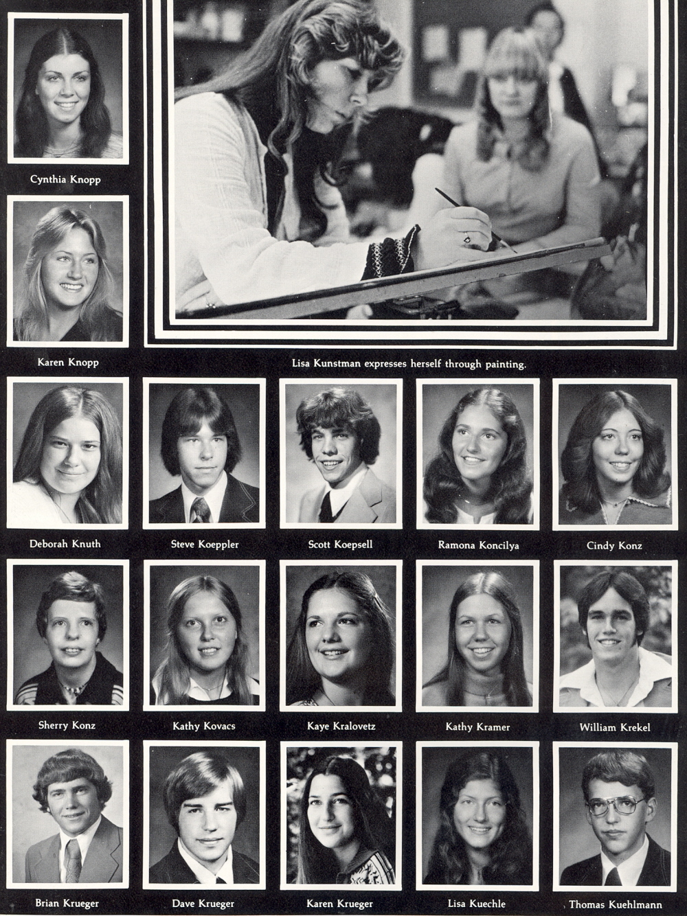 1977 Sheboygan North High School, Page 150: Cynthis Knopp, Karen Knopp, Deborah Knuth, Steve Koeppler, Scott Koepsell, Ramona Koncilya, Cindy Konz, Sherry Konz, Kathy Kovacs, Kaye Kralovetz, Kathy Kramer, William Krekel, Brian Krueger, Dave Krueger, Karen Krueger, Lisa Kuechle, Thomas Kuehlmann.