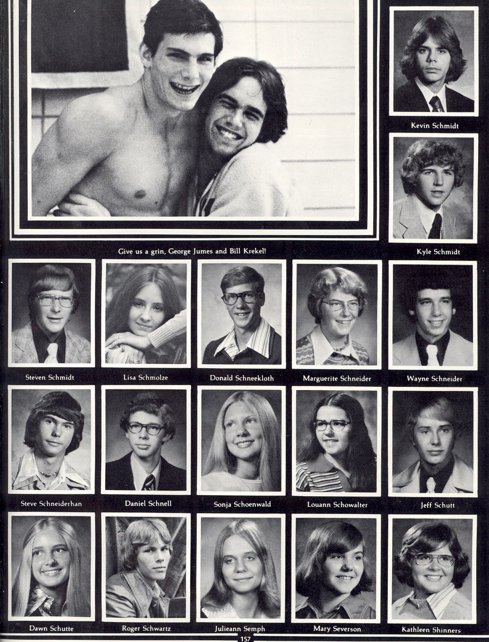 1977 Sheboygan North High School, Page 157: Kevin Schmidt, Kyle Schmidt, Steven Schmidt, Lisa Schmolze, Donald Schneerkloth, Marguerite Schneider, Wayne Schneider, Steve Schneiderhan, Daniel Schnell, Sonja Schoenwald, Louann Schowalter, Jeff Schutt, Dawn Schutte, Roger Schwartz, Julieann Semph, Mary Severson, Kathleen Shinners.