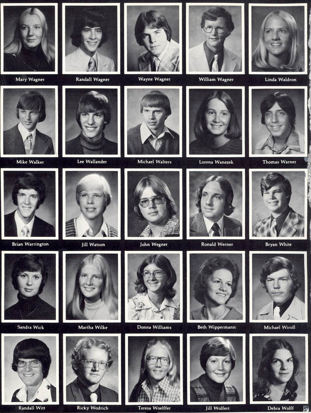 1977 Sheboygan North High School, Page 160: Mary Wagner, Randall Wagner, Wayne Wagner, William Wagner, Linda Waldron, Mike Walker, Lee Wallander, Michael Walters, Lorena Wanezek, Thomas Warner, Brian Warrington, Jill Watson, John Wegner, Ronald Werner, Bryan White, Sandra Wick, Martha Wilke, Donna Williams, Beth Wippermann, Michael Wiroll, Randall Witt, Ricky Wodrich, Teresa Woelffer, Jill Wolfert, Debra Wolff.