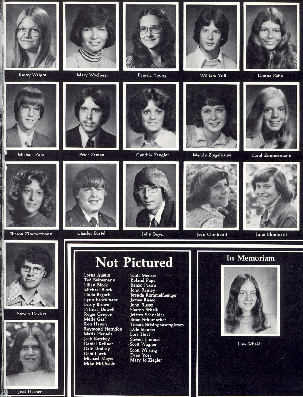 1977 Sheboygan North High School, Page 161: Kathy Wright, Mary Wychesit, Pamela Young, William Yull, Donna Zahn, Michael Zahn, Peter Zeman, Cynthia Zengler, Wendy Ziegelbauer, Carol Zimmermann, Sharon Zimmermann, Charles Bartel, John Beyer, Jean Chminatti, June Chminatti, Steven Dekker, Jodi Fischer, Lisa Scheidt, Lorna Austin, Ted Beinemann, Lilian Block, Michael Block, Linda Brgoch, Lynn Brockmann, Leroy Brown, Patricia Dowell, Roger Genson, Merle Graf, Ron Hayon, Raymond Herndon, Maria Heruela, Jack Katchey, Daniel Kellner, Dale Lindsay, Debi Lueck, Michael Mayer, Mike McQuade, Scott Menzer, Ronald Pape, Renzo Pasini, John Rainey, Brenda Rommelfaenger, James Russo, John Russo, Sharon Schelk, Jeffrey Schneider, Brian Schumacher, Torsak Srisinghasongkram, Dale Stauber, Lori Thiel, Steven Thomas, Scott Wagner, Scott Wilsing, Dean Yost, Mary Ziegler.