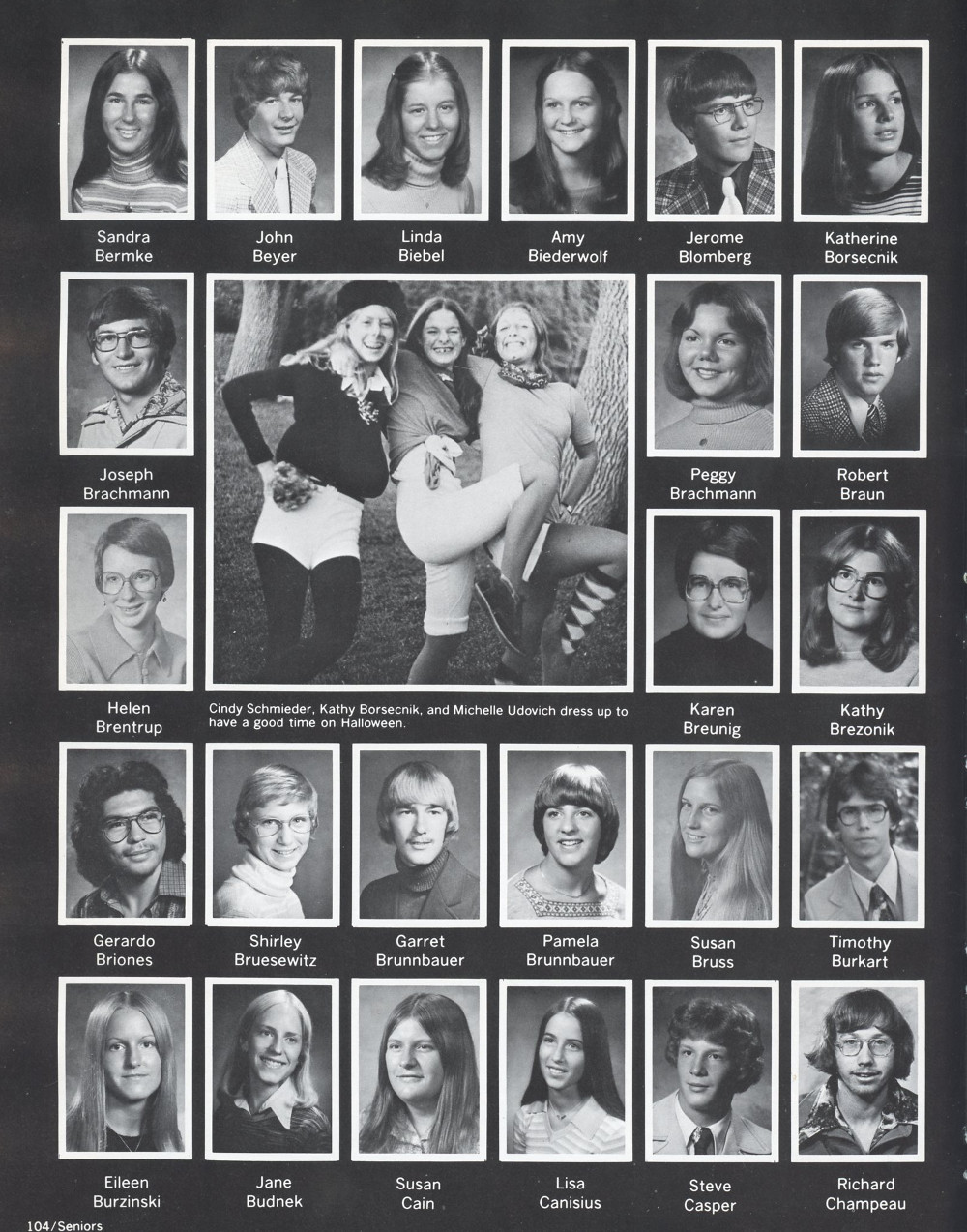 1977 Sheboygan South High School, Page 104: Sandra Bermke, John Beyer, Linda Biebel, Amy Biederwolf, Jerome Blomberg, Katherine Borsecnik, Joseph Brachmann, Peggy Brachmann, Robert Braun, Helen Brentrup, Karen Breunig, Kathy Brezonik, Geraldo Briones, Shirley Bruesewitz, Garret Brunnbauer, Pamela Brunnbauer, Susan Bruss, Timothy Burkart, Eileen Burzinski, Jane Budnek, Susan Cain, Lisa Canisius, Steve Casper, Richard Champeau .