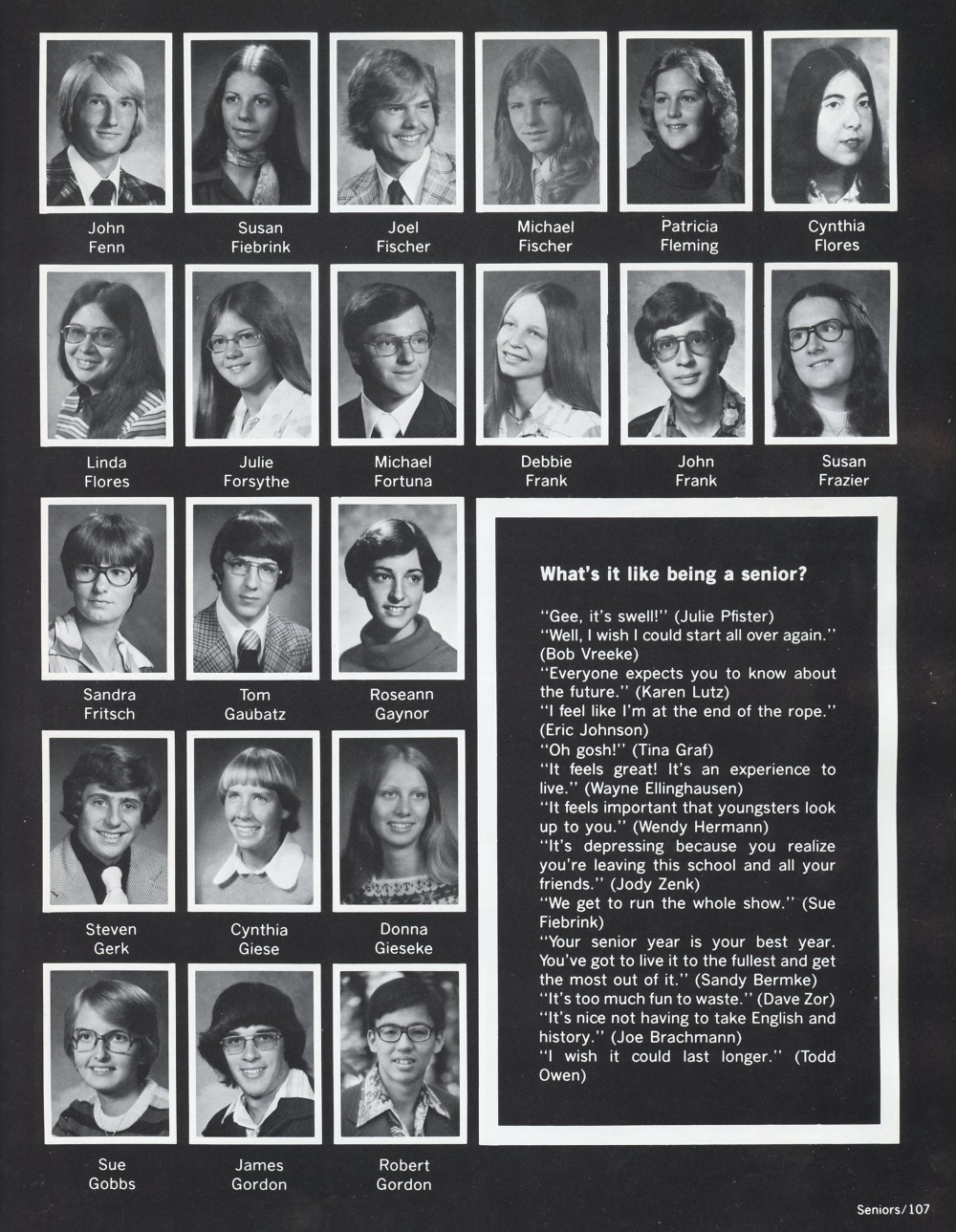 1977 Sheboygan South High School, Page 107: John Fenn, Susan Fiebrink, Joel Fischer, Michael Fischer, Patricia Fleming, Cynthia Flores, Linda Flores, Julie Forsythe, Michael Fortuna, Debbie Frank, John Frank, Susan Frazier, Sandra Fritsch, Tom Gaubatz, Roesann Gaynor, Steven Gerk, Cynthia Giese, Donna Gieseke, Sue Gobbs, James Gordon, Robert Gordon.