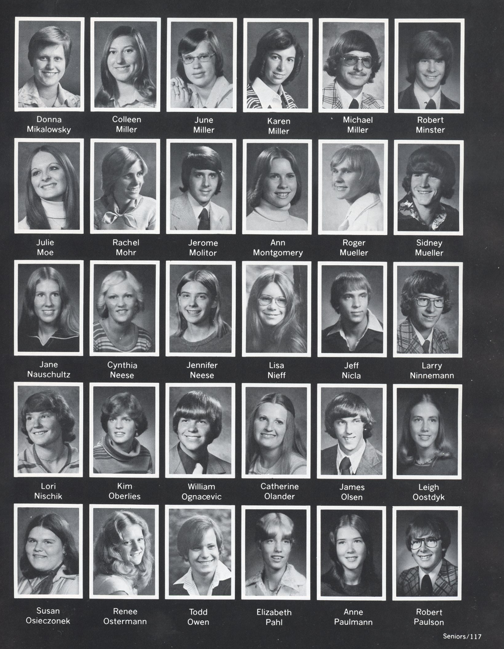 1977 Sheboygan South High School, Page 117: Donna Mikalowsky, Colleen Miller, June Miller, Karen Miller, Michael Miller, Robert Minster, Julie Moe, Rachel Mohr, Jerome Molitor, Ann Montgomery, Roger Mueller, Sidney Mueller, Jane Nauschultz, Cynthia Neese, Jennifer Neese, Lisa Nieff, Jeff Nicla, Larry Ninnemann, Lori Nischik, Kim Oberlies, William Obnacevic, Catherine Olander, James Olsen, Leigh OOstdyk, Susan Osieczonek, Renee Ostermann, Todd Owen, Elizabeth Pahl, Anne Paulmann, Robert Paulson .