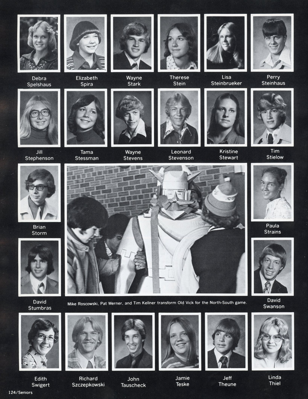 1977 Sheboygan South High School, Page 124: Debra Spelshaus, Elizabeth Spira, Wayne Stark, Therese Stein, Lisa Steinbrueker, Perry Steinhaus, Jill Stephenson, Tama Stessman, Wayne Stevens, Leonard Stevenson, Kristine Stewart, Tim Stielow, Brian Storm, Paula Strains, David Stumbras, David Swanson, Edith Swigert, Richard Szczepkowski, John Tauscheck, Jamie Teske, Jeff Theune, Linda Thiel .