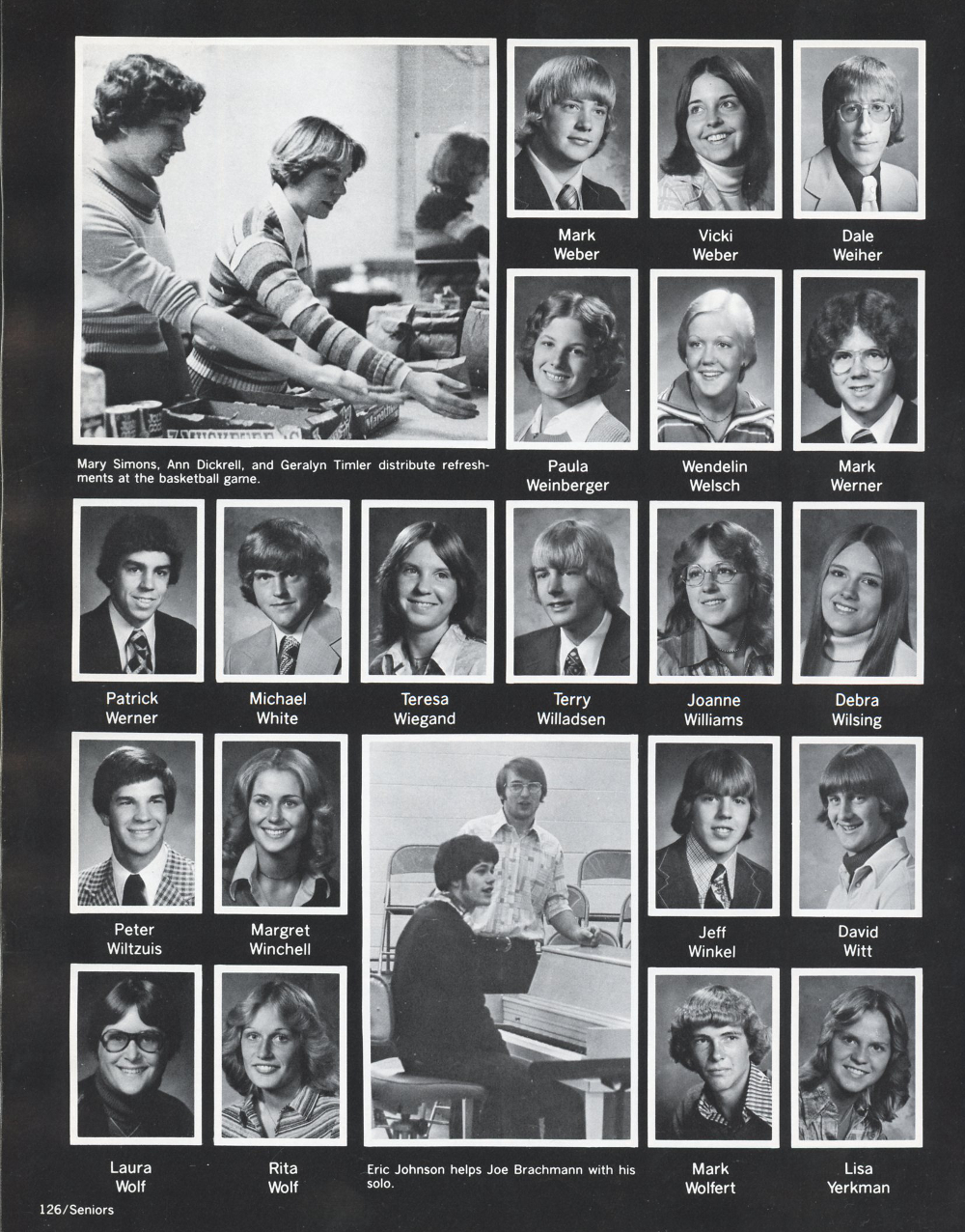 1977 Sheboygan South High School, Page 126: Mark Weber, Vicki Weber, Dale Weiher, Paula Weinberger, Wendelin Welsch, Mark Werner, Patrick Werner, Michael White, Teresa Wiegand, Terry Willadsen, Joanne Williams, Debra Wilsing, Peter Wiltzuis, Margaret Winchell, Jeff Winkel, David Witt, Laura Wolf, Rita Wolf, Mark Wolfert, Lisa Yerkman .