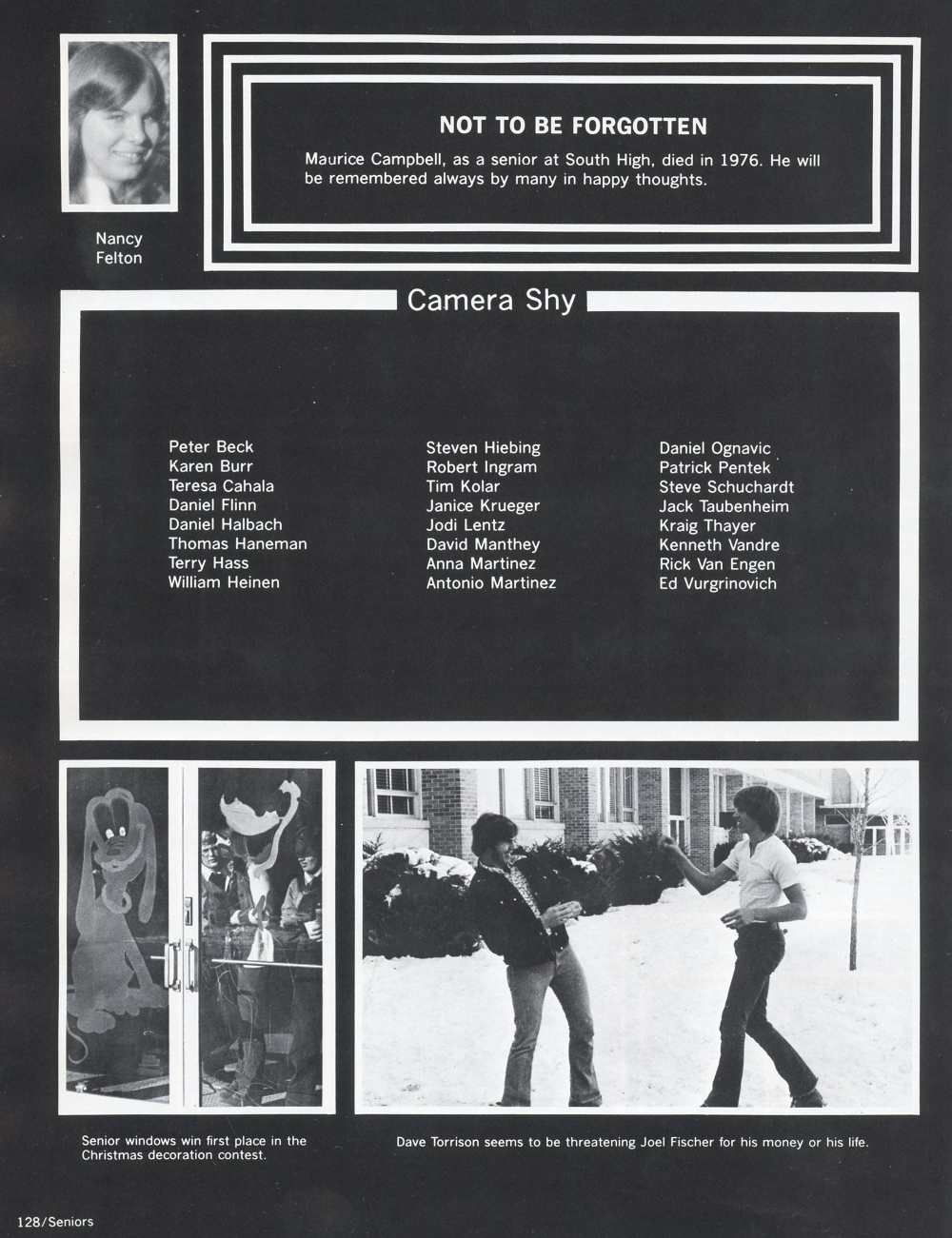1977 Sheboygan South High School, Page 128: Nancy Felton, Peter Beck, Karen Burr, Teresa Cahala, Daniel Flinn, Daniel Halbach, Thomas Haneman, Terry Haas, William Heinen, Steven Hiebing, Robert Ingram, Tim Kolar, Janice Krueger, Jodi Lentz, David Manthey, Anna Martinez, Antonio Martinez, Daniel Ognavic, Patrick Pentek, Steve Schuchardt, Jack Taubenheim, Kraig Thayer, Kenneth Vandre, Rick Van Engen, Ed Vurgrinovich, Maurice Campbell .