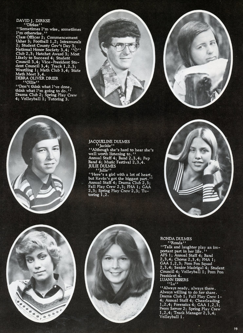 1978 Oostburg High School Page 19: David J. Dirkse, Debra Oliver Drier, Jacqueline Dulmes, Julie Dulmes, Ronda Dulmes, Luann Ebbers.