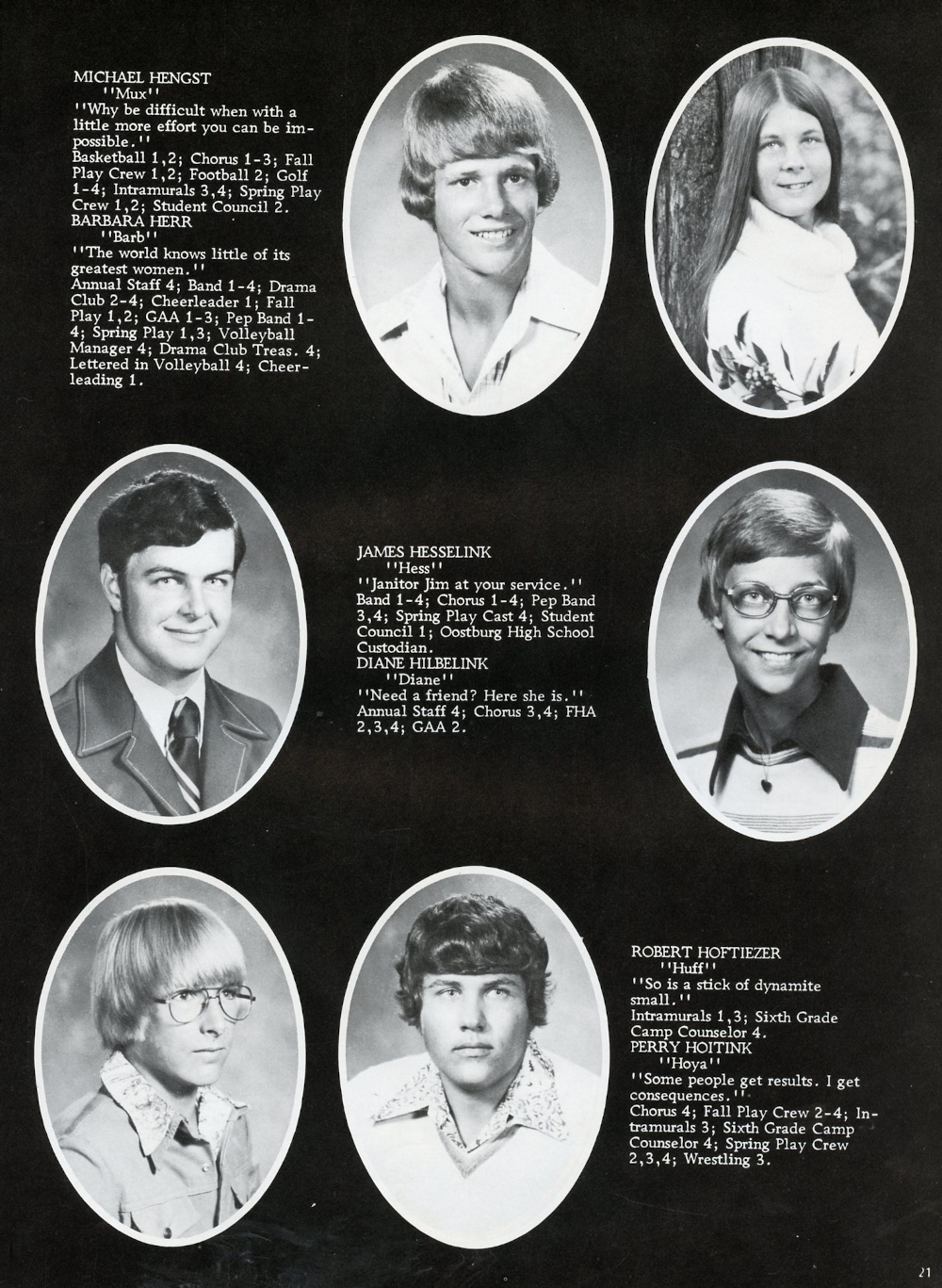 1978 Oostburg High School Page 21: Michael Hengst, Barbara Herr, James Hesselink, Diane Hilbelink, Robert Hoftiezer, Perry Hoitink.