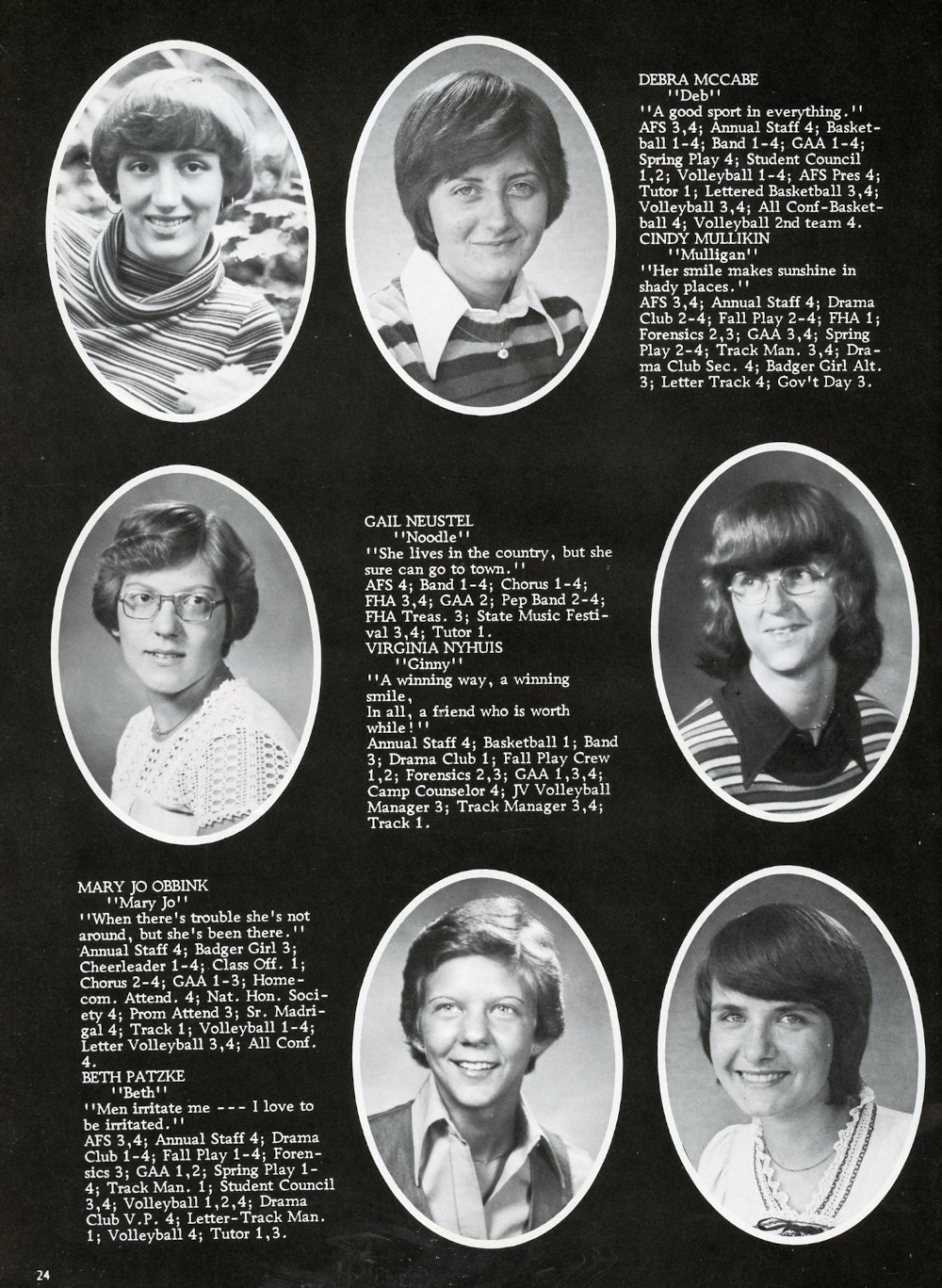 1978 Oostburg High School Page 24: Debra McCabe, Cindy Mullikin, Gail Neustel, Virginia Nyhuis, Mary Jo Obbink, Beth Patzke.