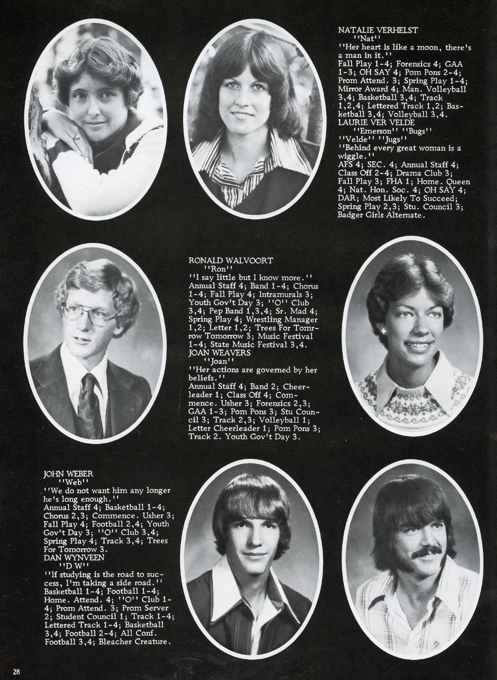 1978 Oostburg High School Page 28: Natalie Verhelst, Laurie Ver Velde, Ronald Walvoort, Joan Weavers, John Weber, Dan Wynveen.